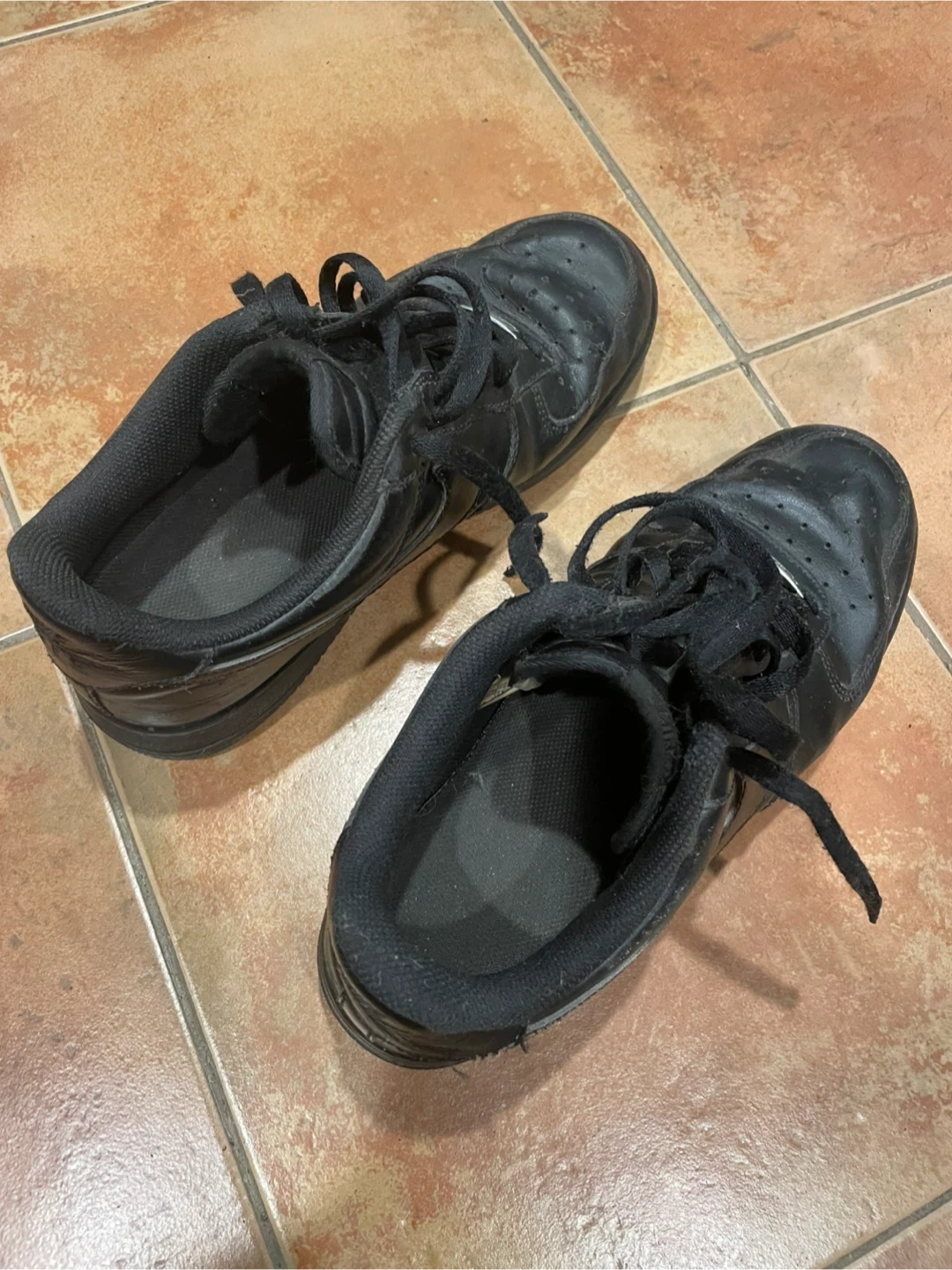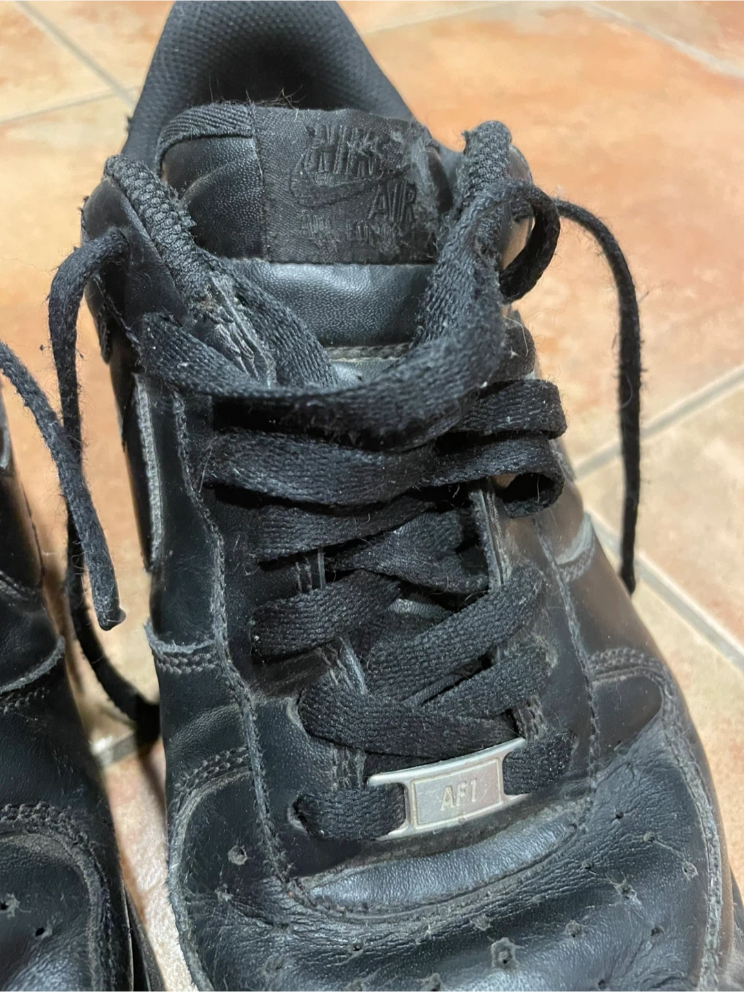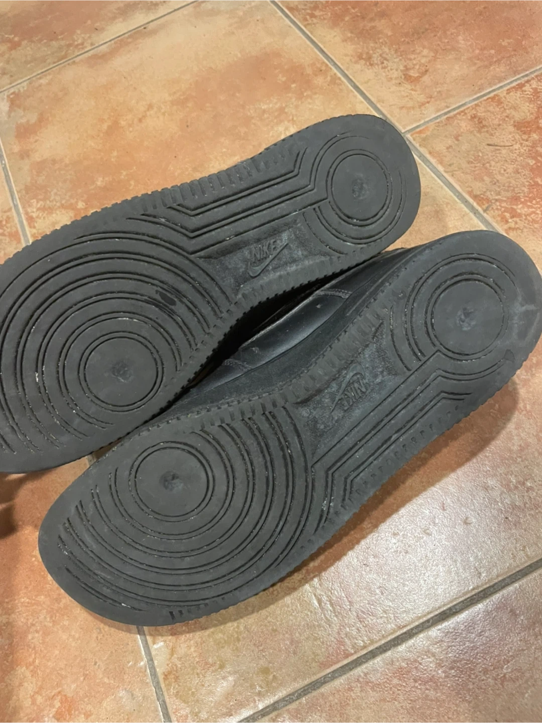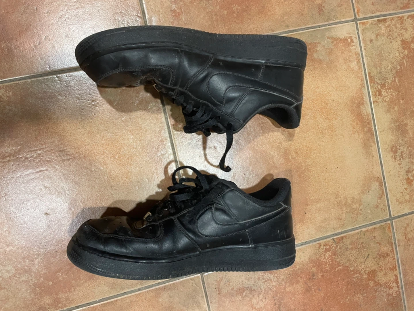 Selling a pair of black Nike Air Force 1 sneakers. They show some signs of wear, but they've still got lots of life left in them! Size men’s us 11.