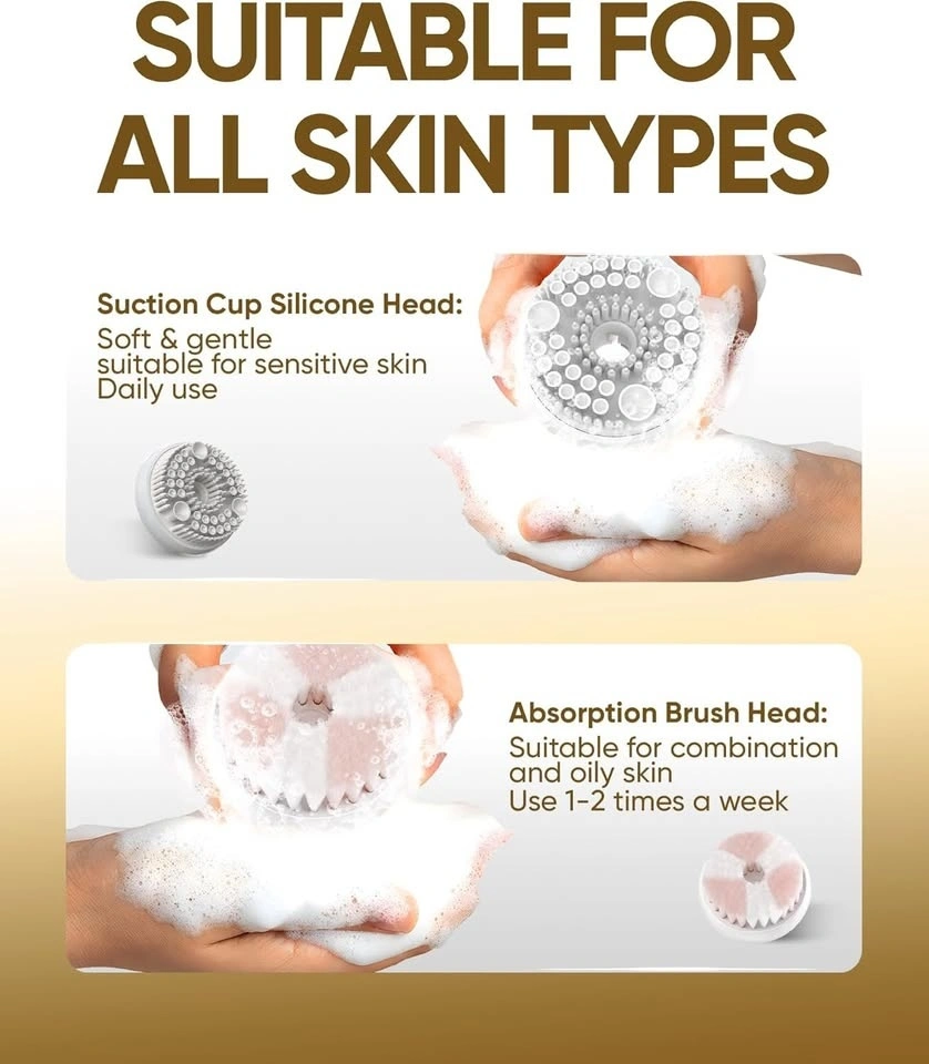 Suitable for All Skin Types – The soft silicone face scrubber head is for sensitive skin and daily use. The adsorption brush head is specially designed for oily and combination skin, delivering customized care 1-2 times a week