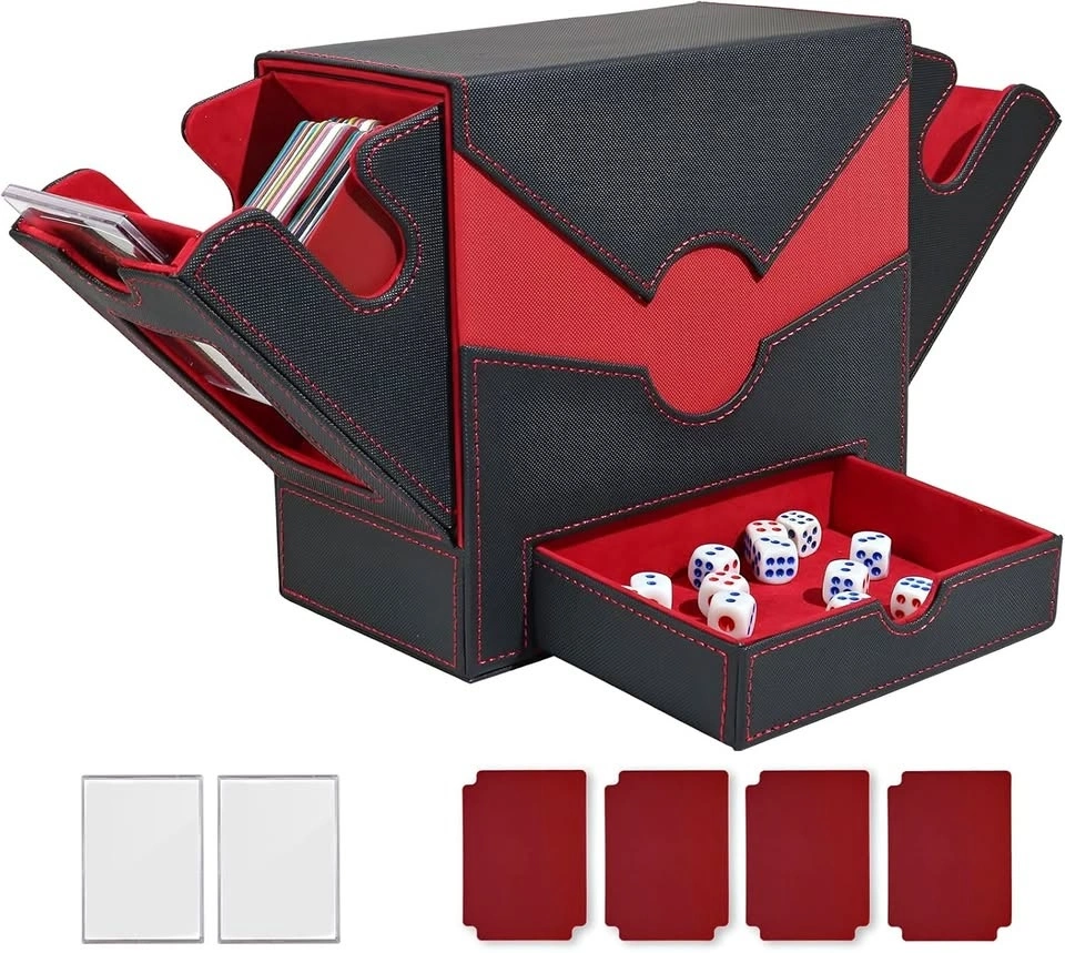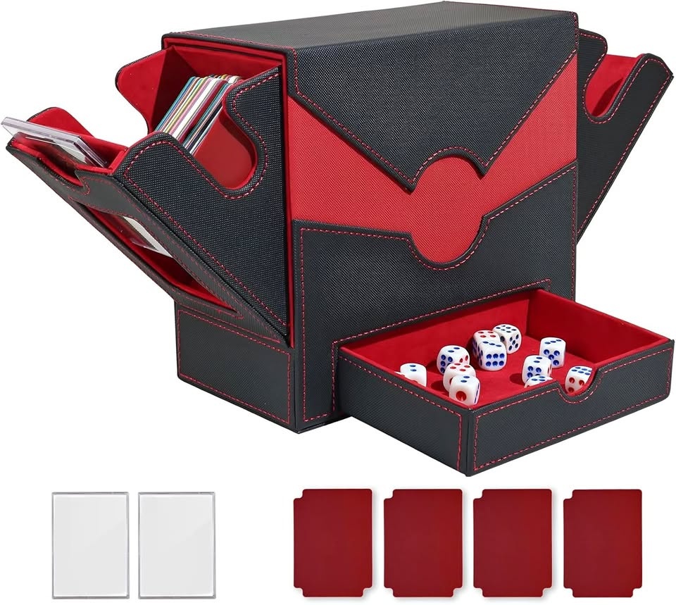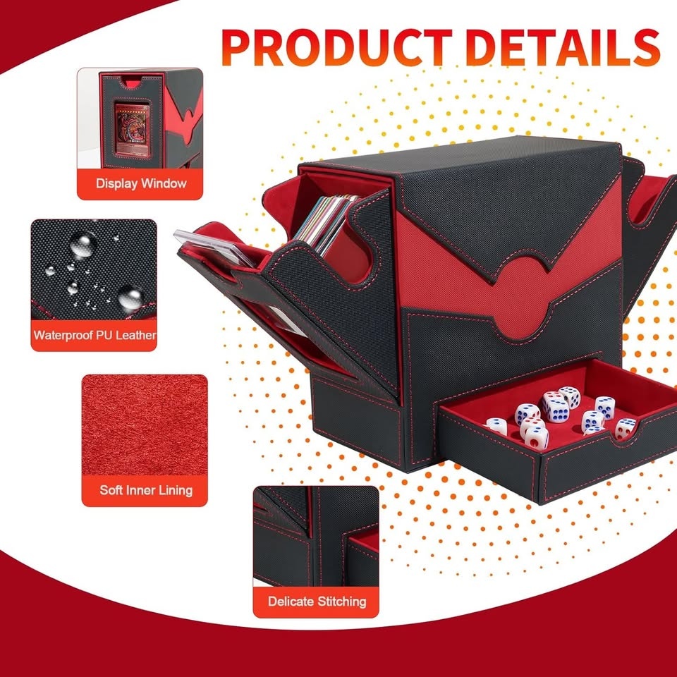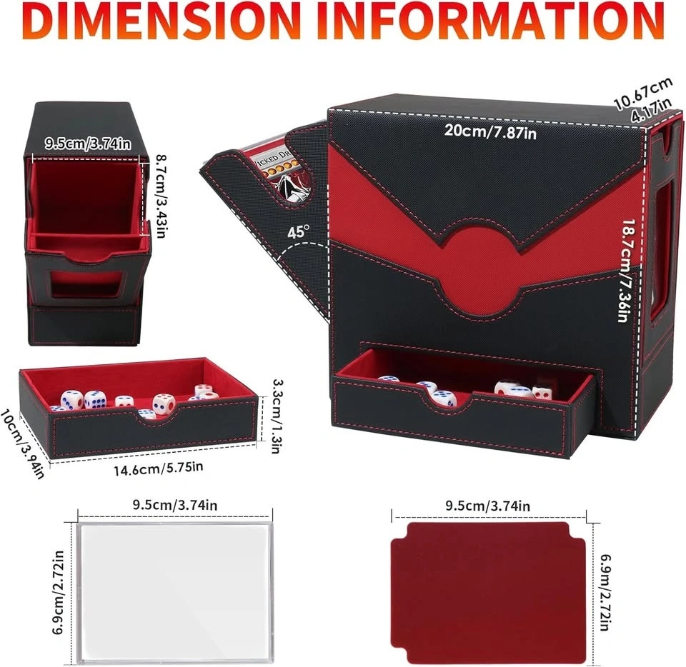This trading card storage box has 2 separate compartments and a dice/token box. It measures 7.87*7.36*4.17 inch and has two separate card windows on the side, which allow you to display the commander's character.