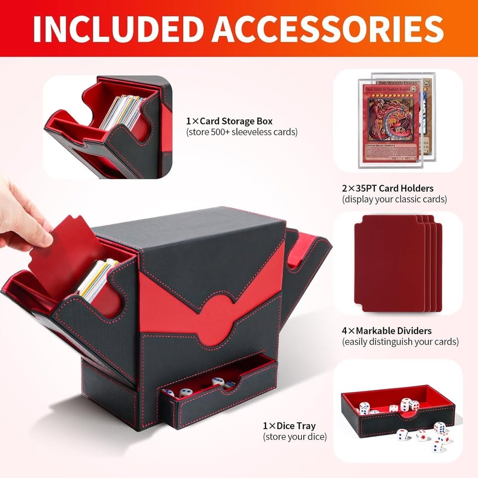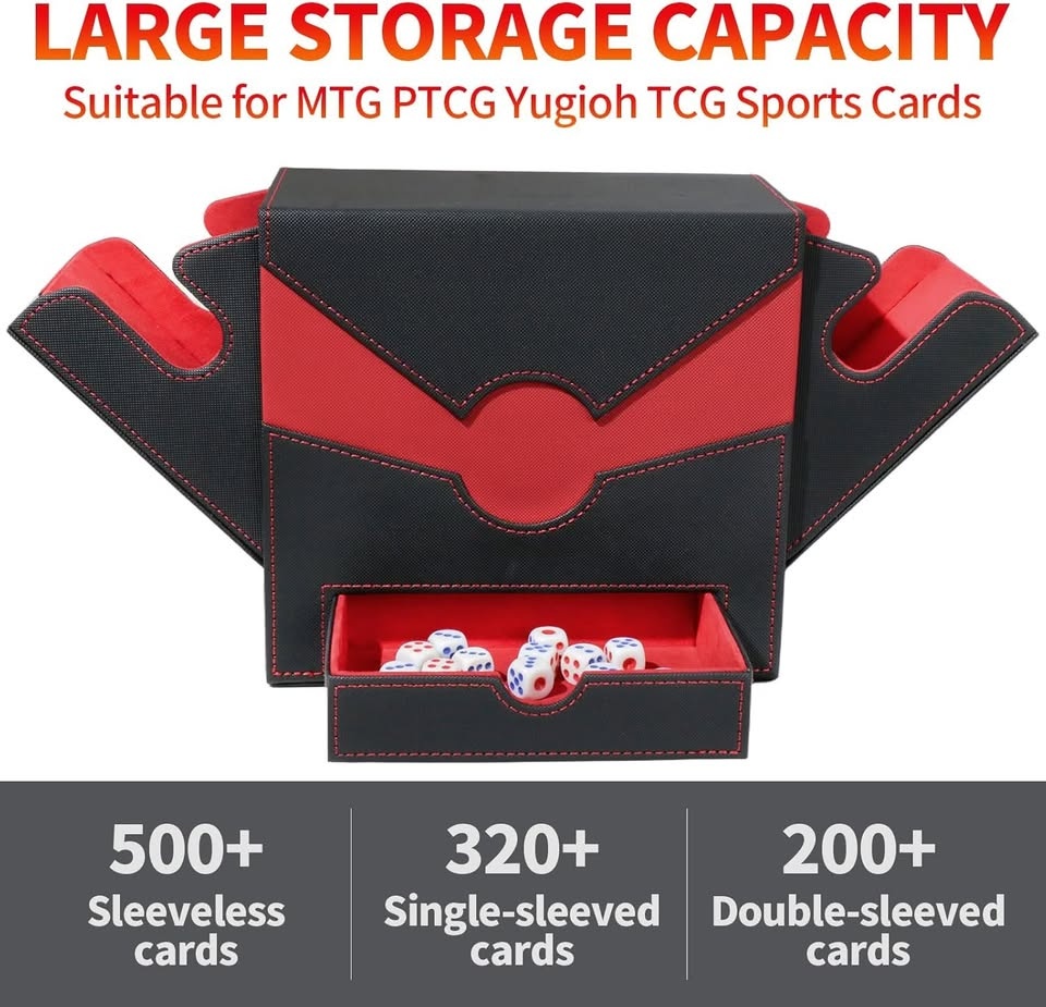 The commander deck box has two compartments which are compatible with both double-sleeved and single-sleeved cards, with the exception of top-loading cards. Holds up to 500+ sleeveless cards, 320+ single-sleeved cards or 200+ double-sleeved cards. The unique U-shaped opening allows you to easily remove cards during play. A dice tray is also included.