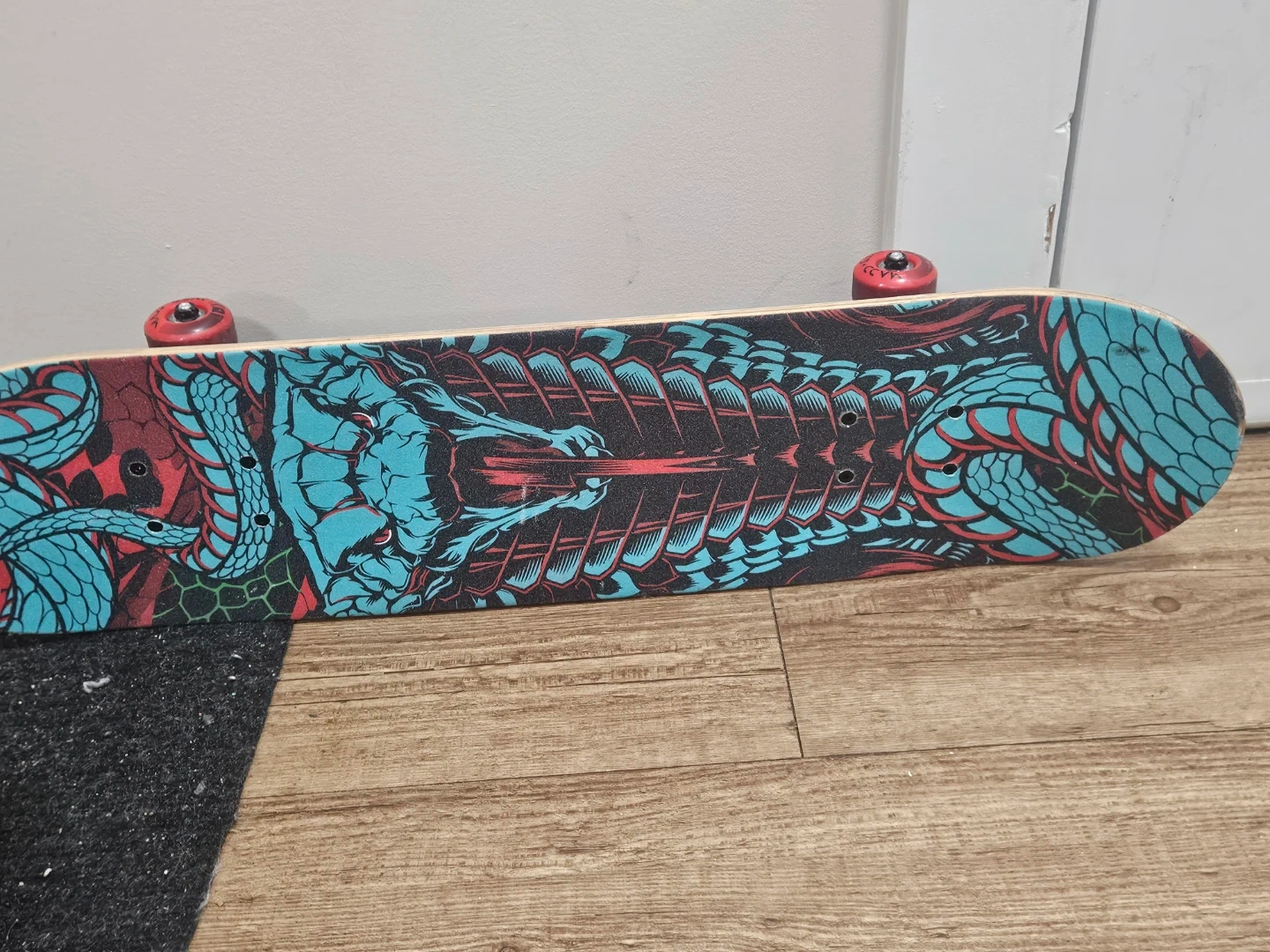 Selling a skateboard with a cool snake design! It's in good condition and ready to ride. Perfect for anyone looking to cruise around town or practice some tricks