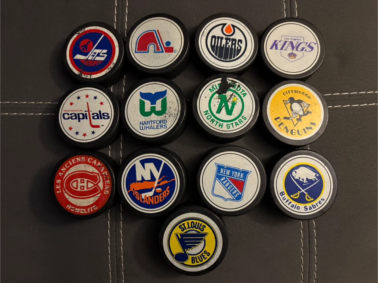 Selling a collection of vintage NHL hockey pucks! Some have seen more wear than others. Selling them all together. They feature logos from various teams, including the Oilers, Kings, Jets, Capitals, Canadiens, Whalers, North Stars, Penguins, Islanders, Rangers, Blues, and Sabres.