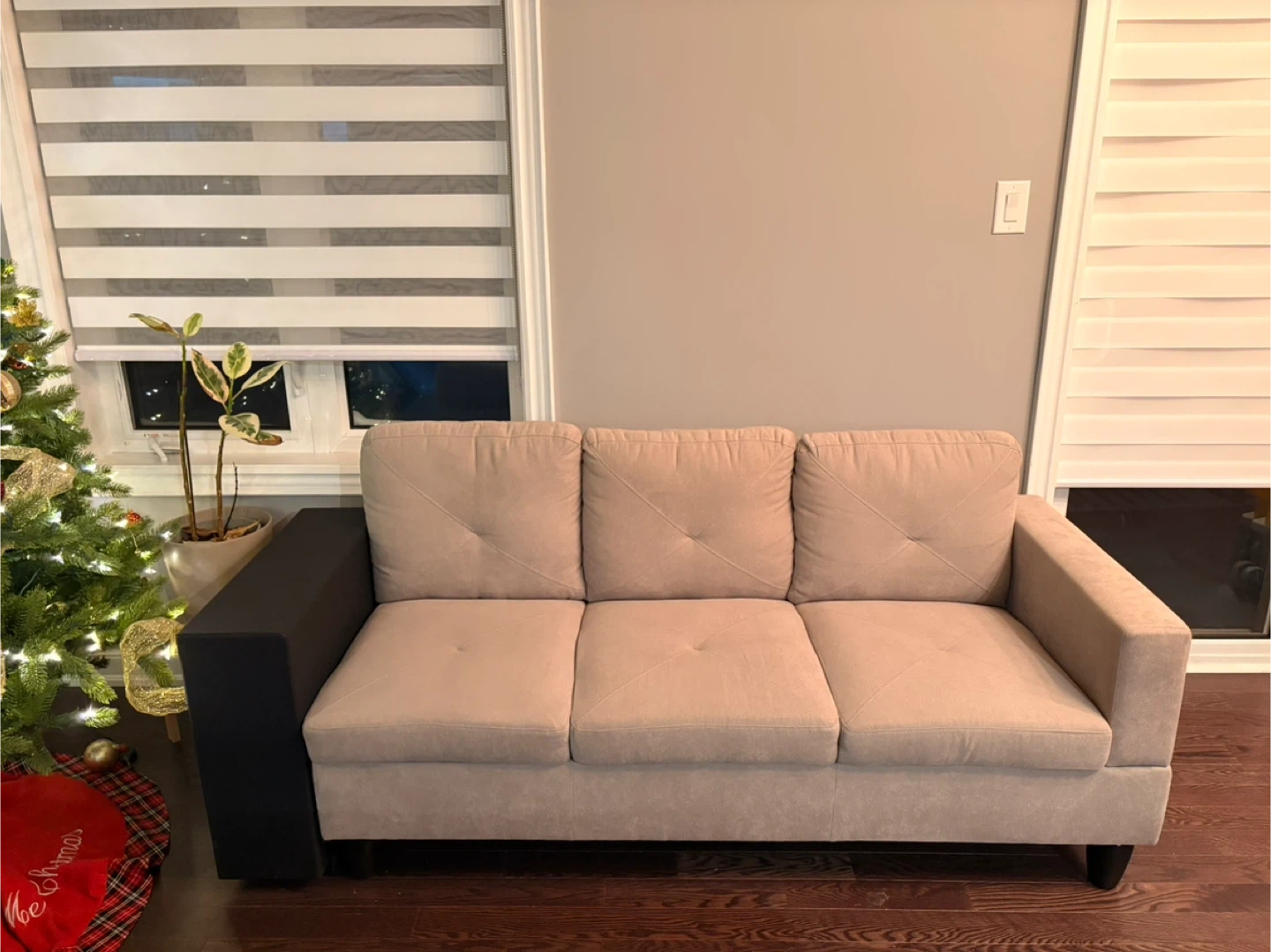 Selling a comfy beige sofa that's in great shape! It features a stylish black side table attached, perfect for holding your drinks or books while you relax. The sofa has a neutral colour that should fit in with most decor styles. It's a great addition to any living room or den