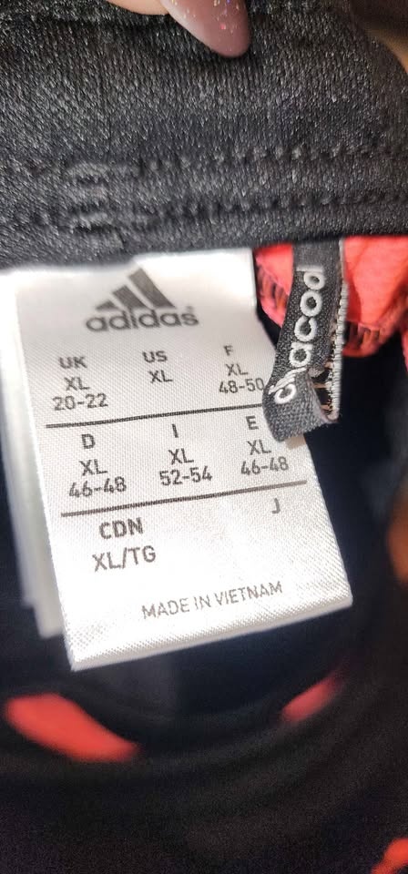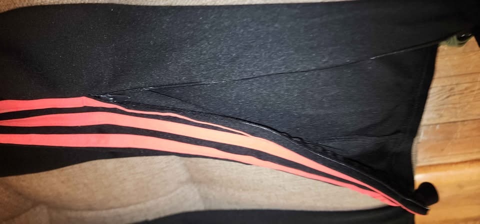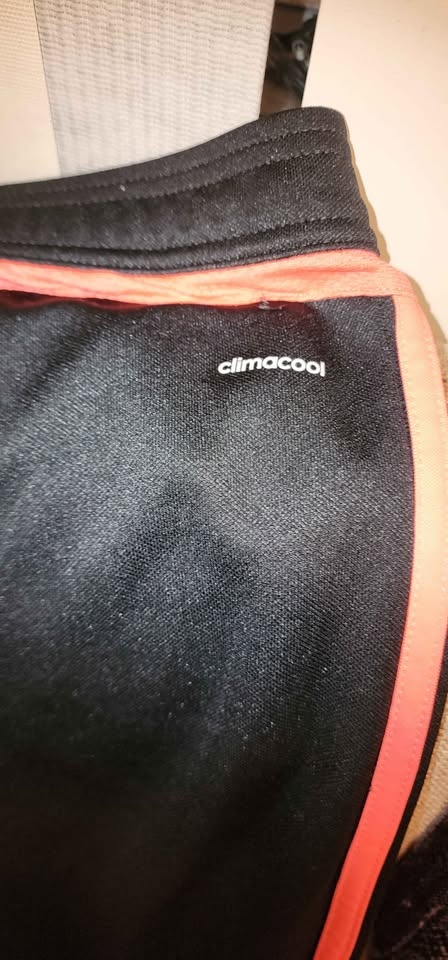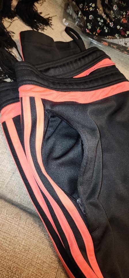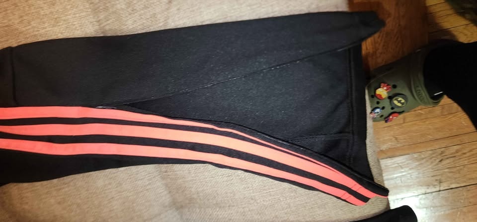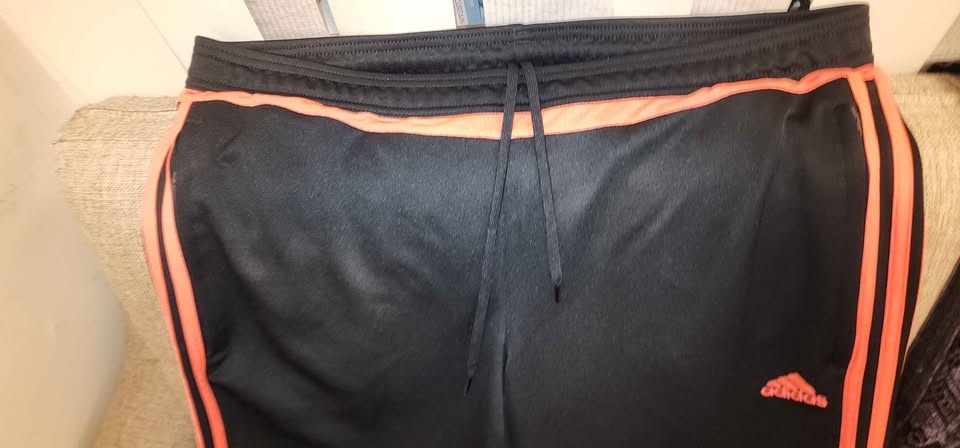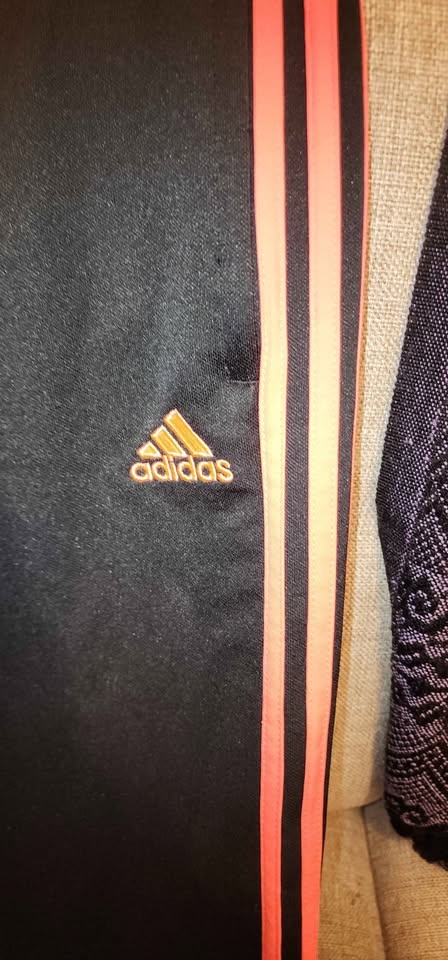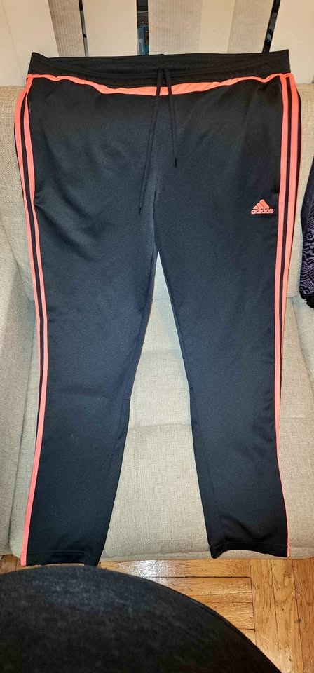 Adidas Women's 3-Stripes Tricot Joggers in black with bright pink flamingo stripes.