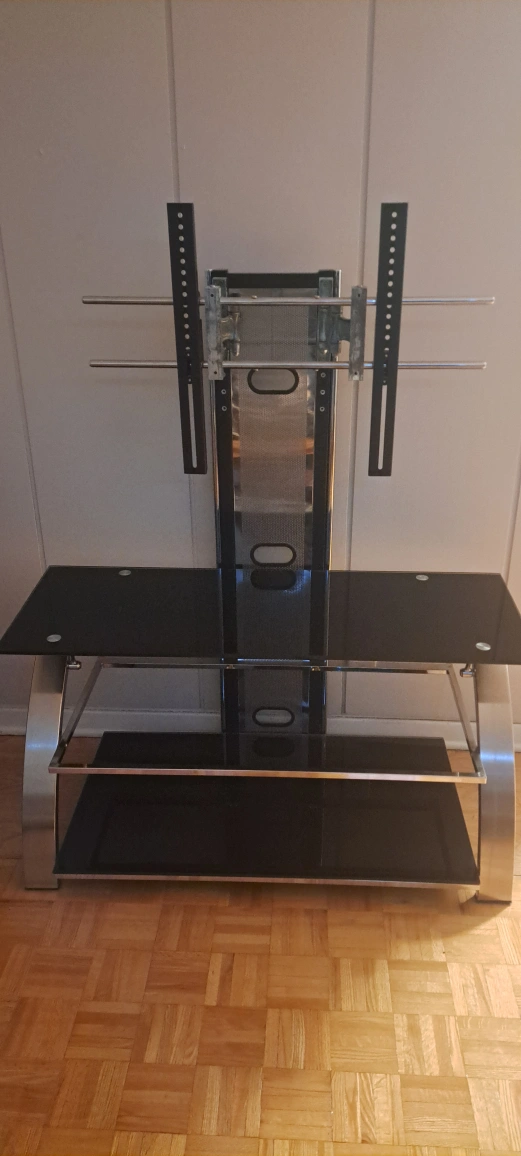Selling a stylish TV stand with a black glass top and chrome frame. It features multiple shelves for storage and a built-in TV mount. Perfect for any living room setup!