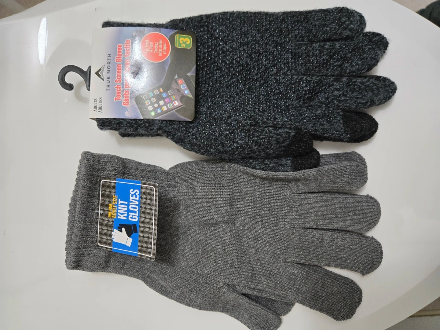 Selling pairs of adult-sized gloves! One pair is True North touch screen gloves in a dark grey colour, and the other is a pair of knit gloves in light grey. Both are adult size.