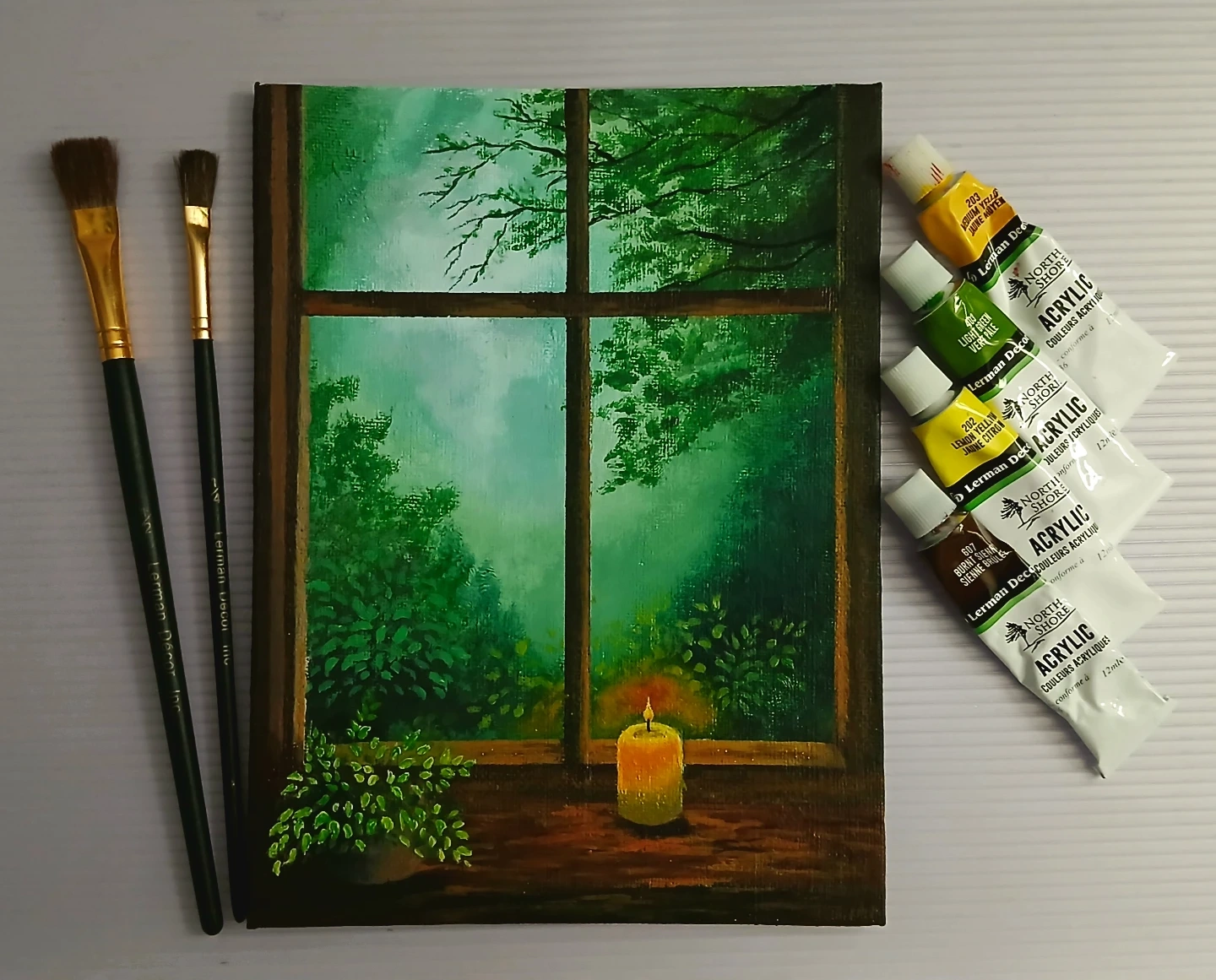 Acrylic painting on canvas. This piece captures a serene view through a window, complete with a candlelit sill and lush greenery. Perfect for adding a touch of tranquility to any room!