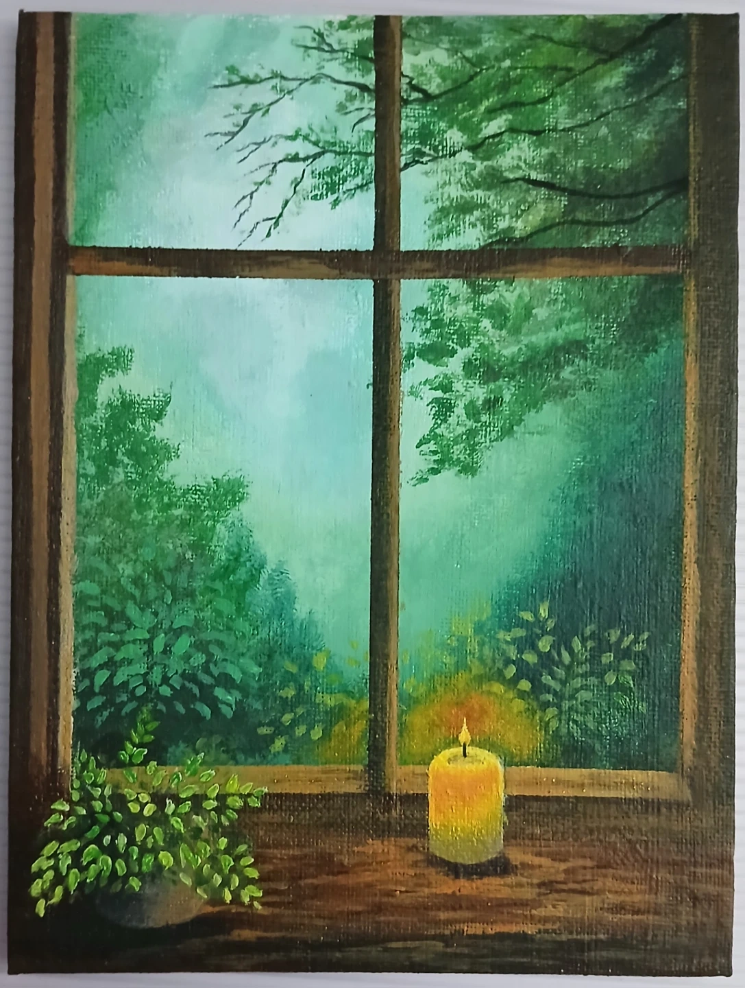 Acrylic painting on canvas. This piece captures a serene view through a window, complete with a candlelit sill and lush greenery. Perfect for adding a touch of tranquility to any room!