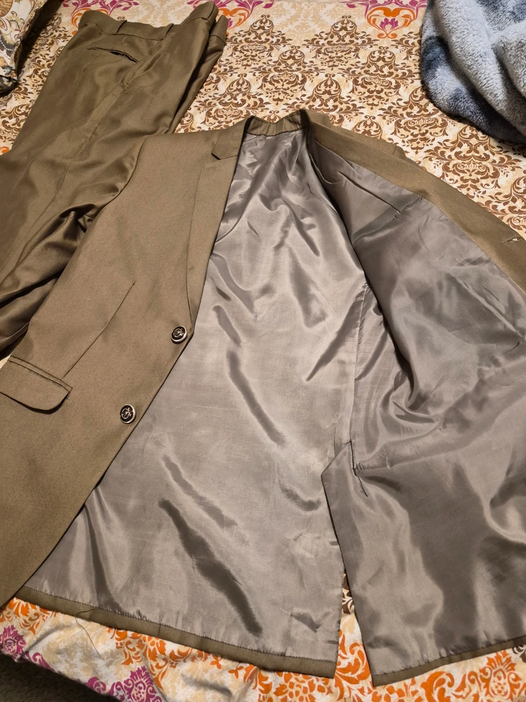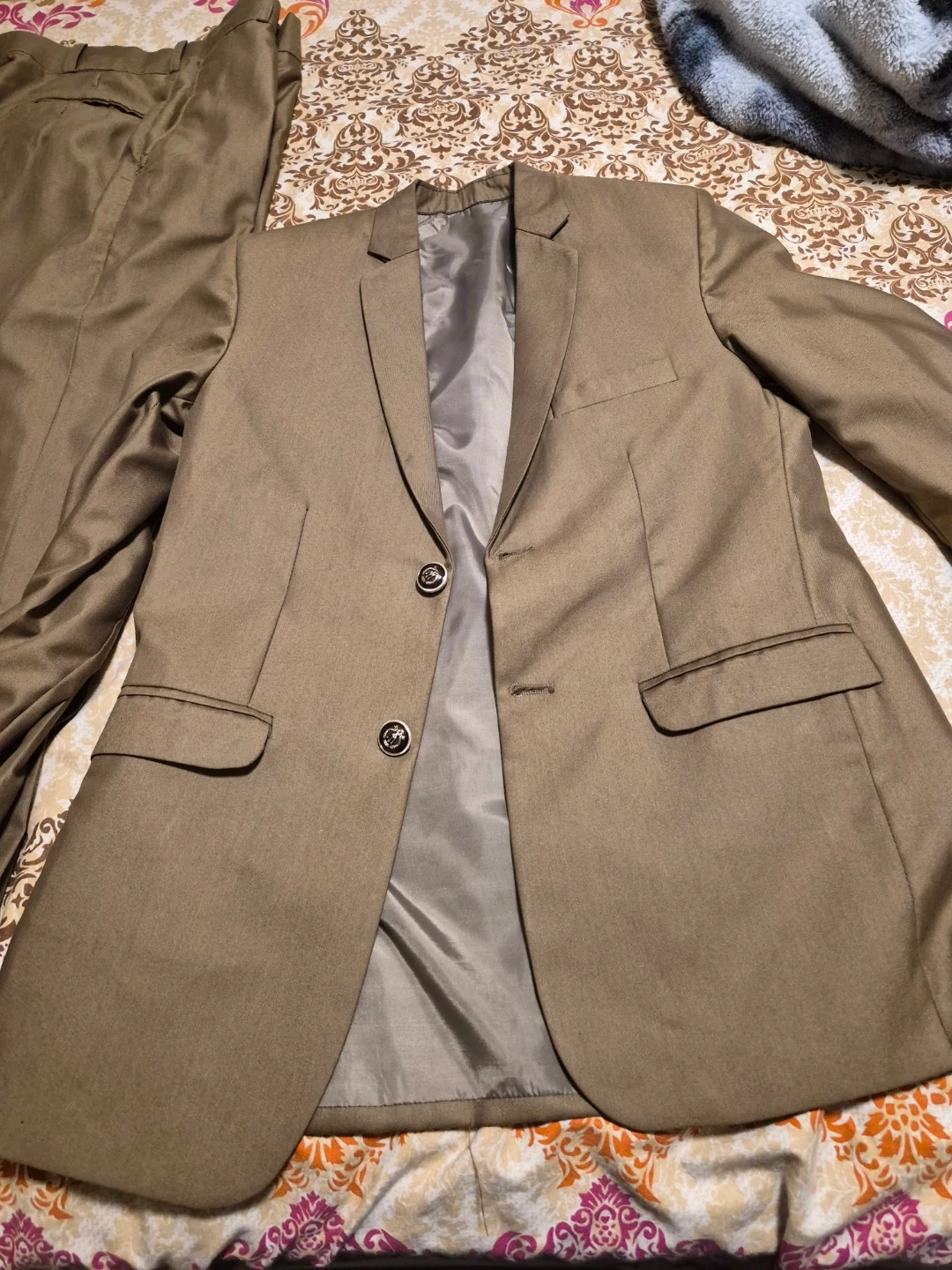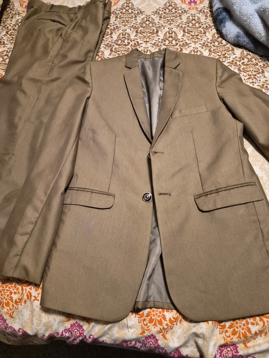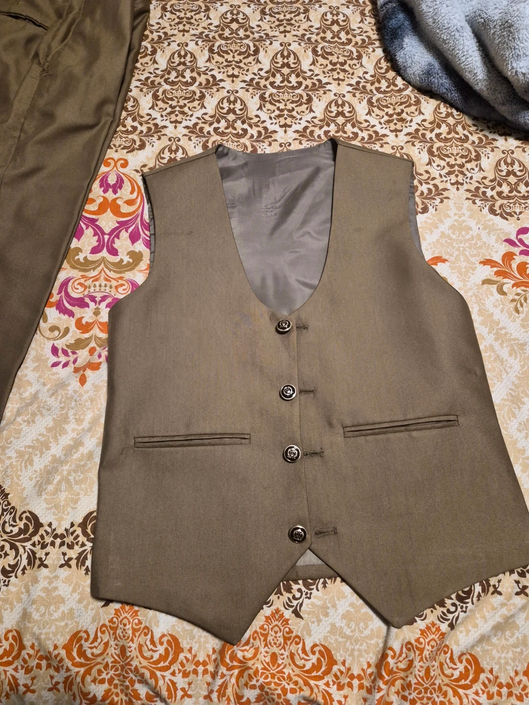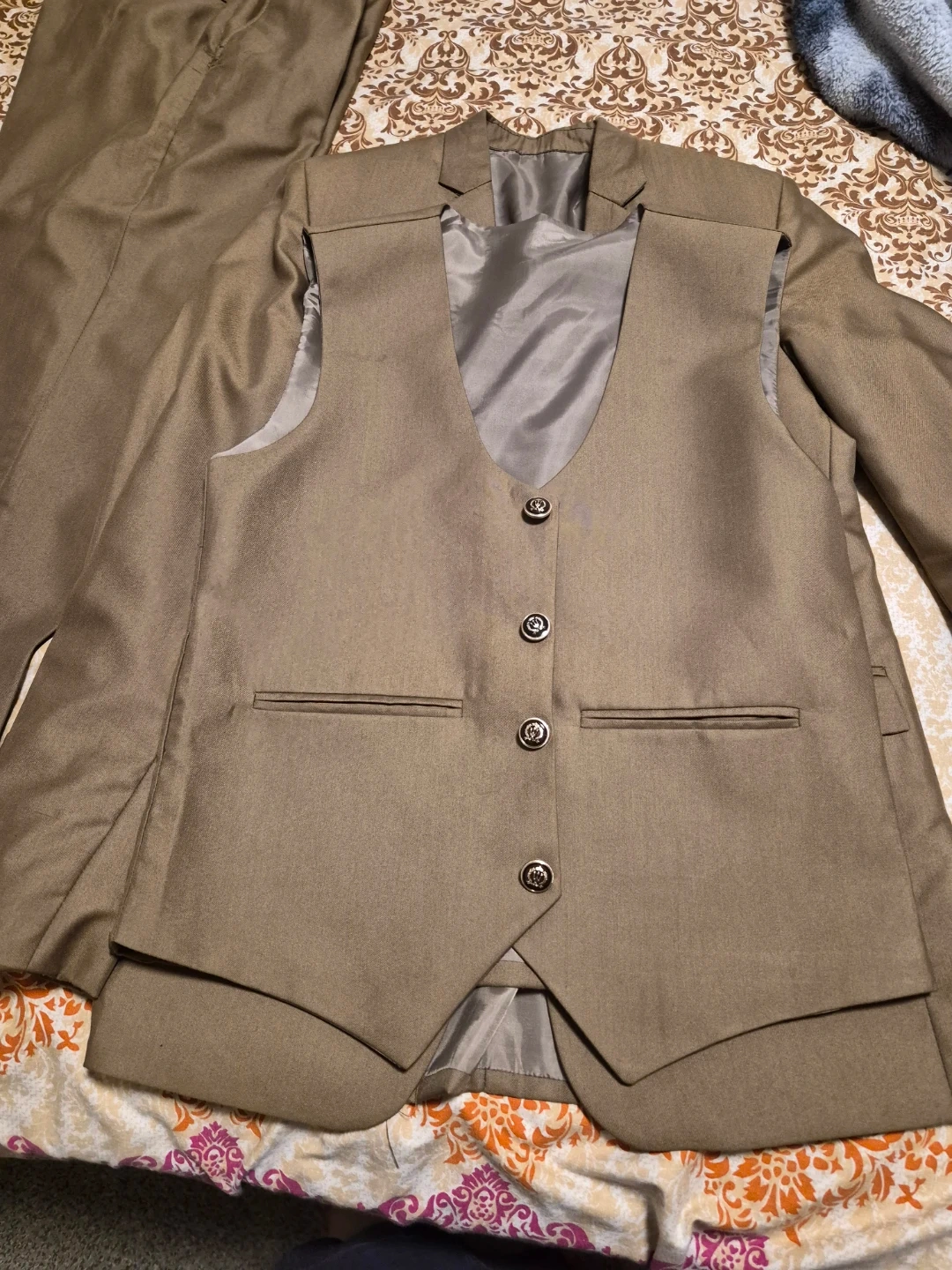 Selling a men's brown suit, which includes the jacket, pants, and vest. It's in great shape and ready for a new owner. Weared just once. Neat and clean suit in size 30.