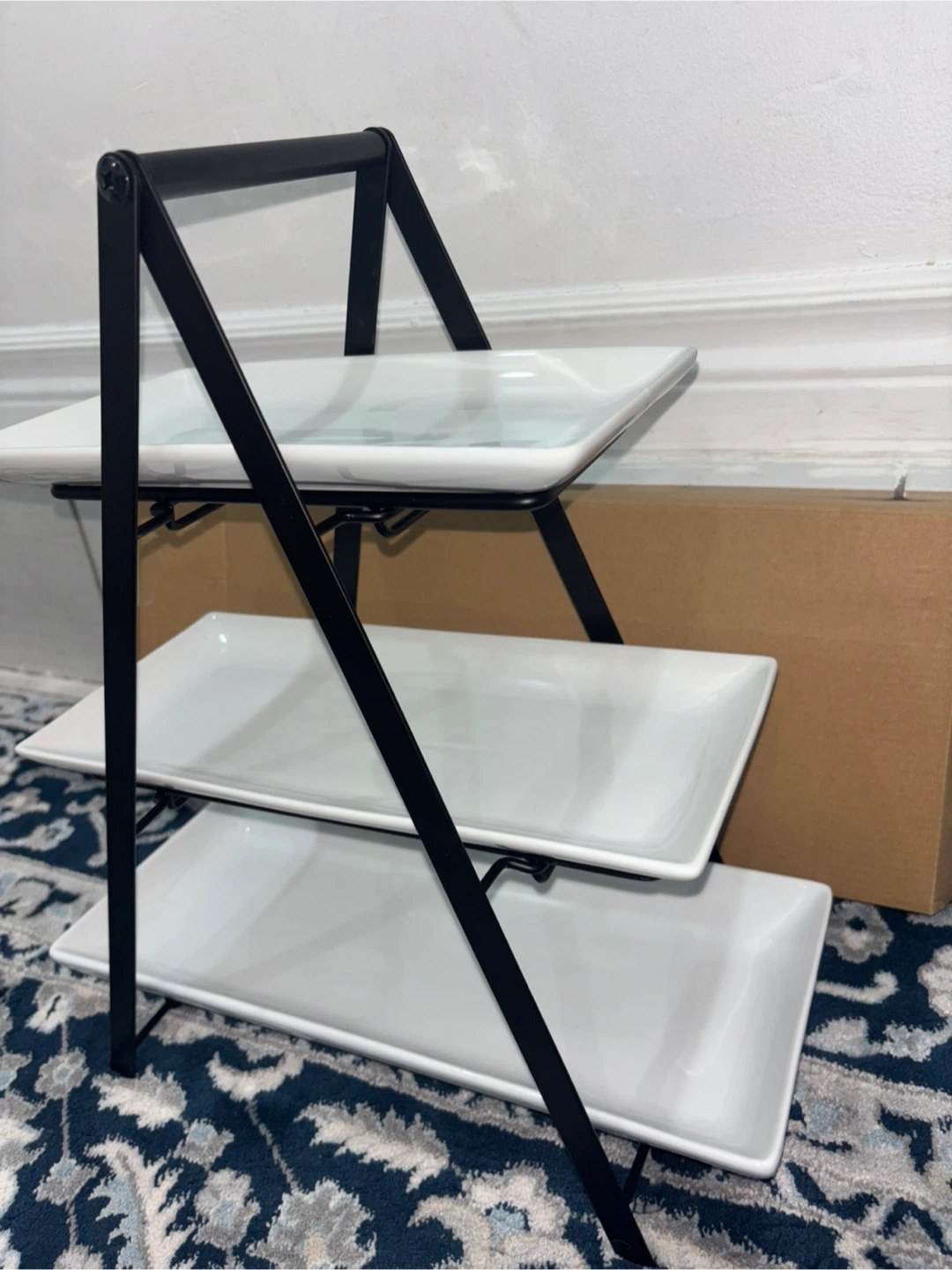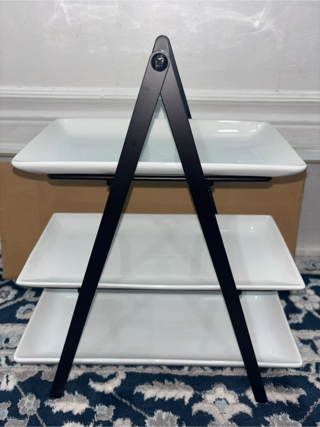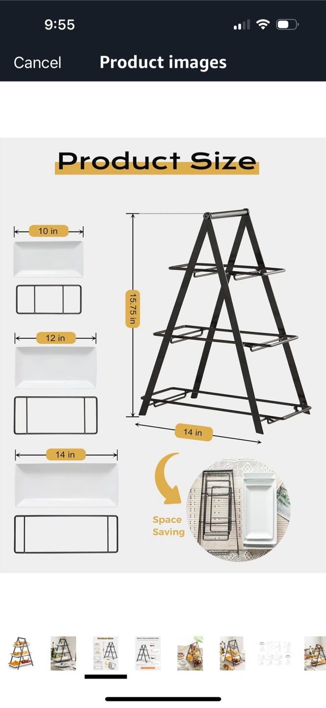 Selling a YHOSSEUN 3-tier serving tray stand! It comes with ceramic serving platters and a metal rack. The platters are rectangular and measure 10, 12, and 14 inches. Perfect for parties, weddings, or baby showers!