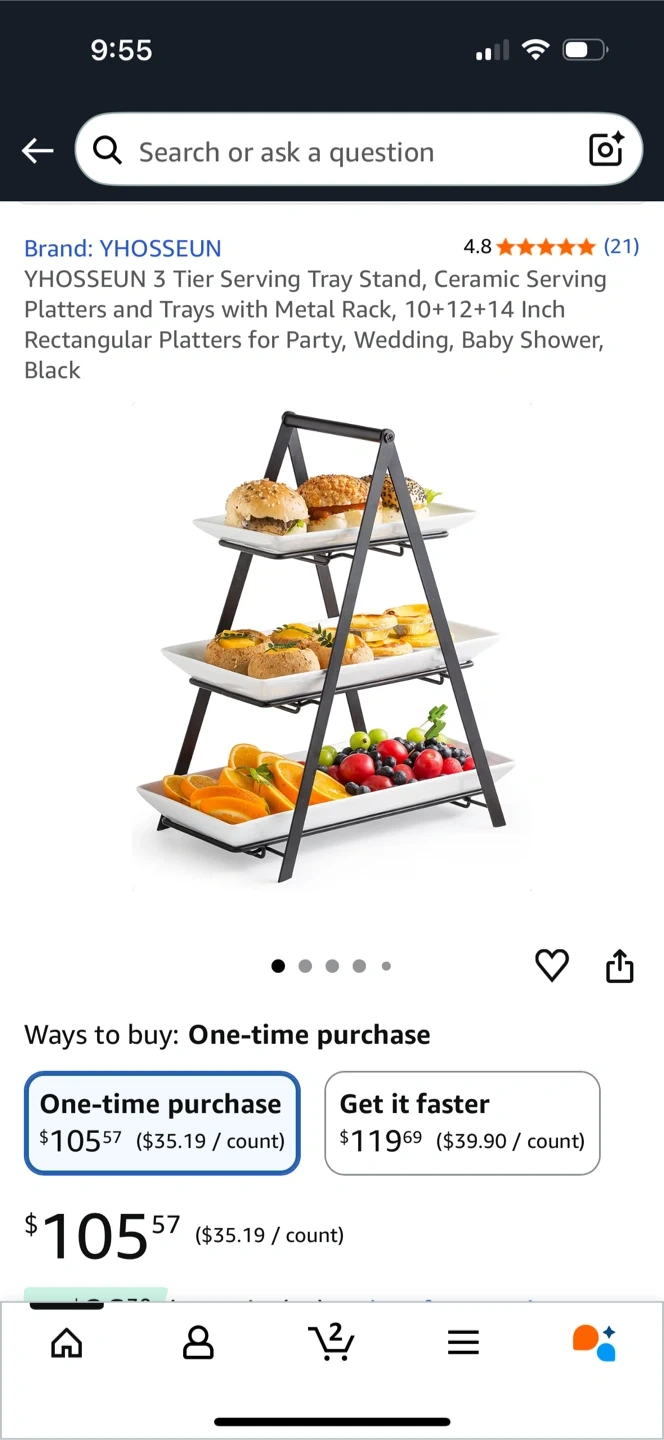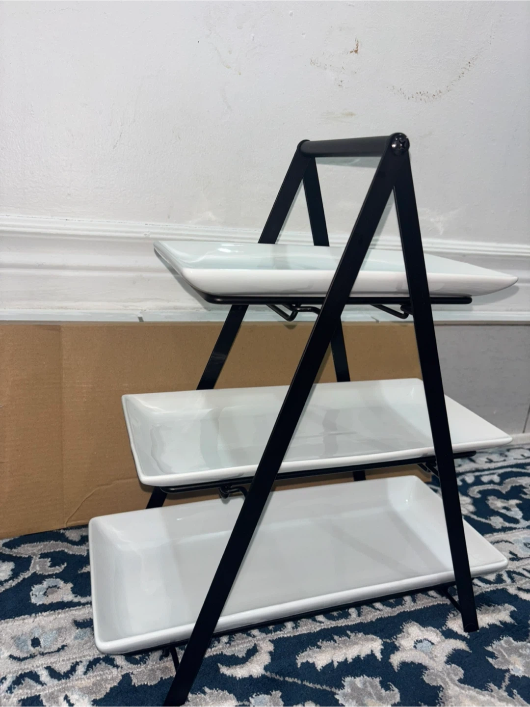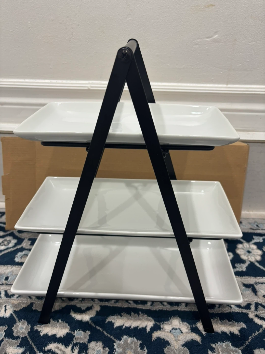 Selling a YHOSSEUN 3-tier serving tray stand! It comes with ceramic serving platters and a metal rack. The platters are rectangular and measure 10, 12, and 14 inches. Perfect for parties, weddings, or baby showers!