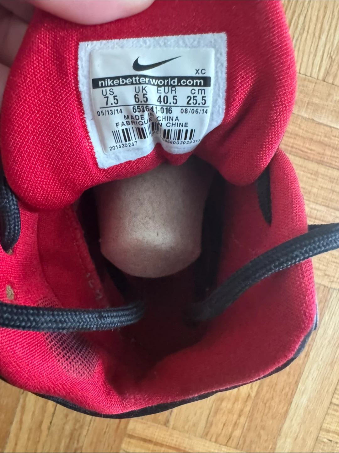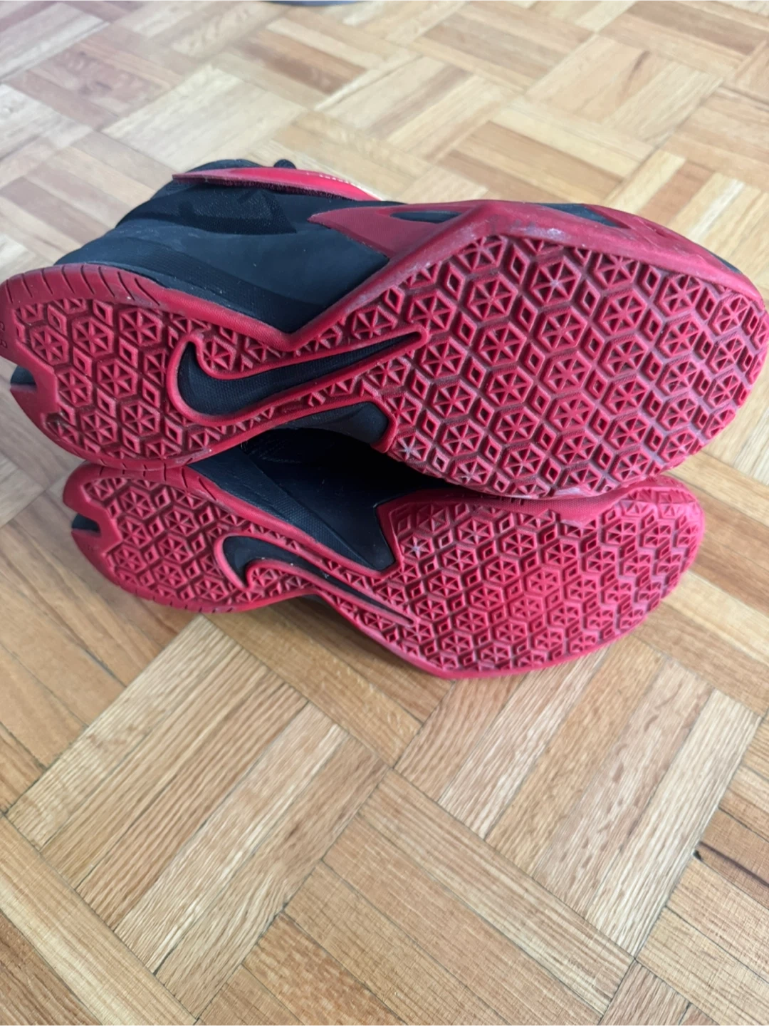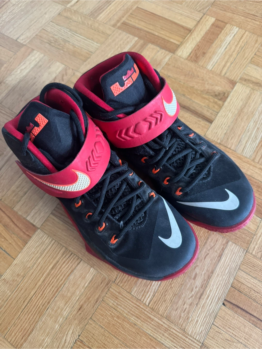 Selling a pair of Nike LeBron zoom soldier 6 basketball shoes in size US 7.5. (Actual size is 7 because these shoes are slim fit) They are black and red. The shoes show some signs of wear on the soles, but are otherwise in good condition. Great for basketball or casual wear!