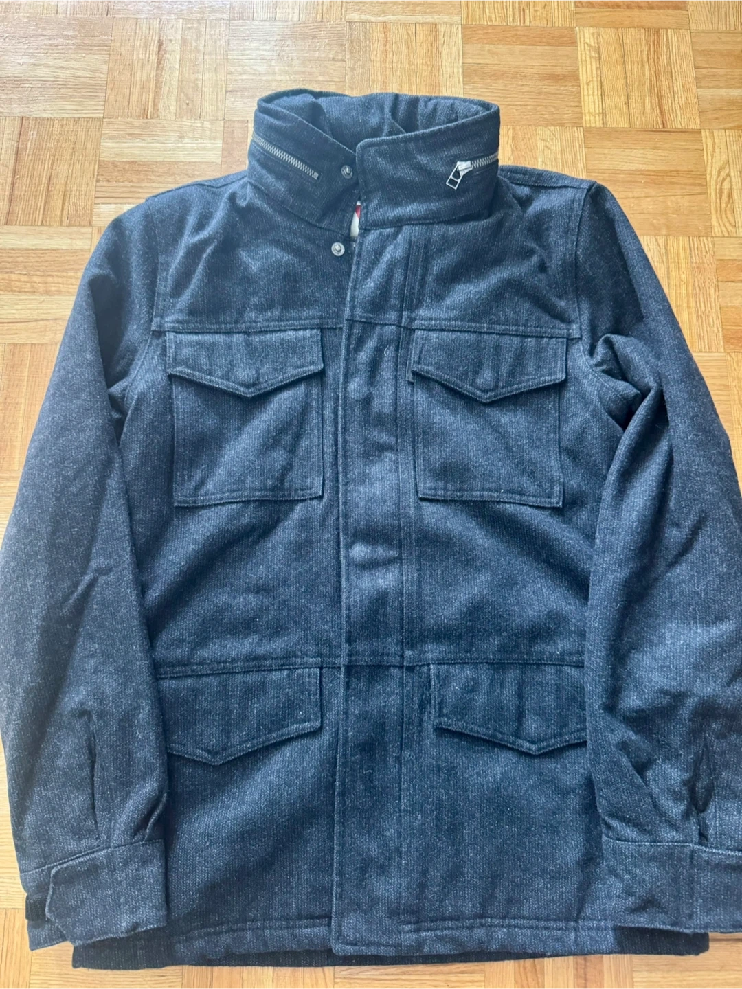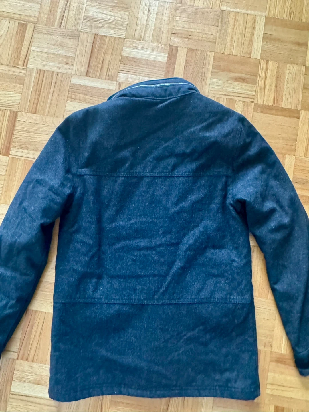 This jacket is a size small and slim fit. It's a wool blend, perfect for cooler weather. The jacket features a stylish design with multiple pockets and it has a hiding hoodie with zipper.