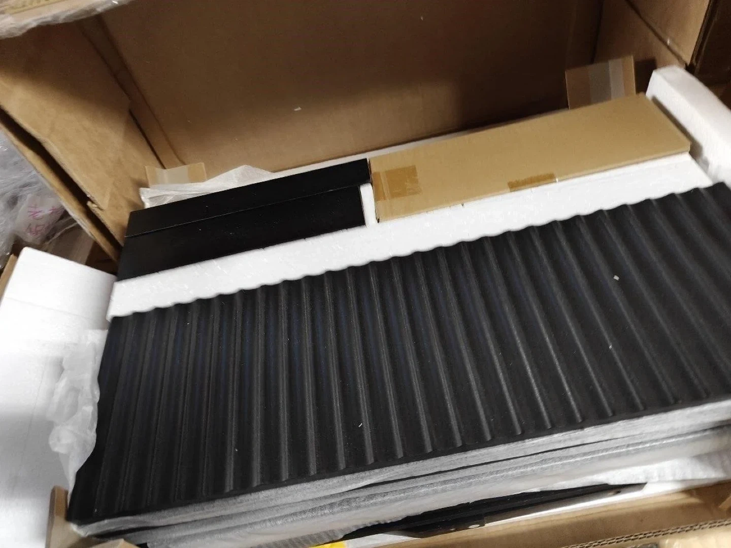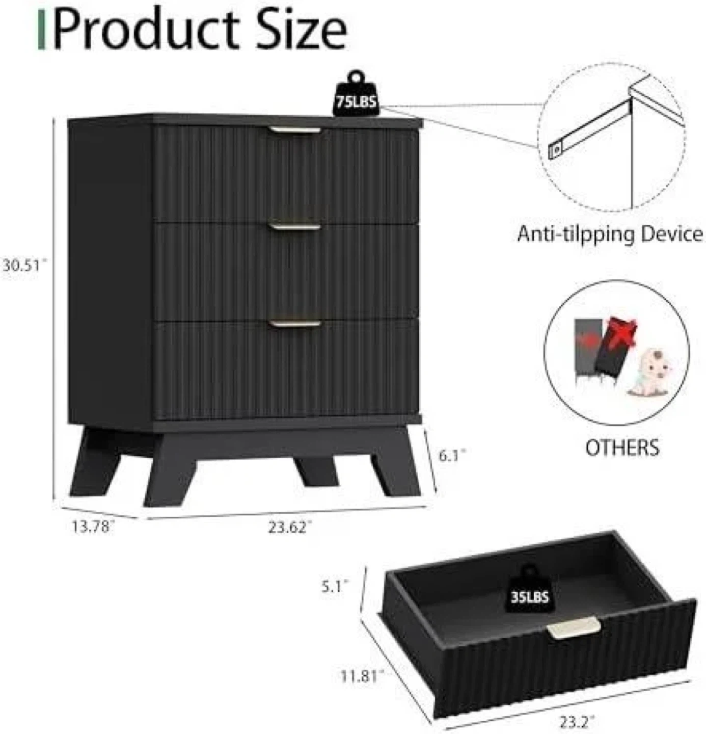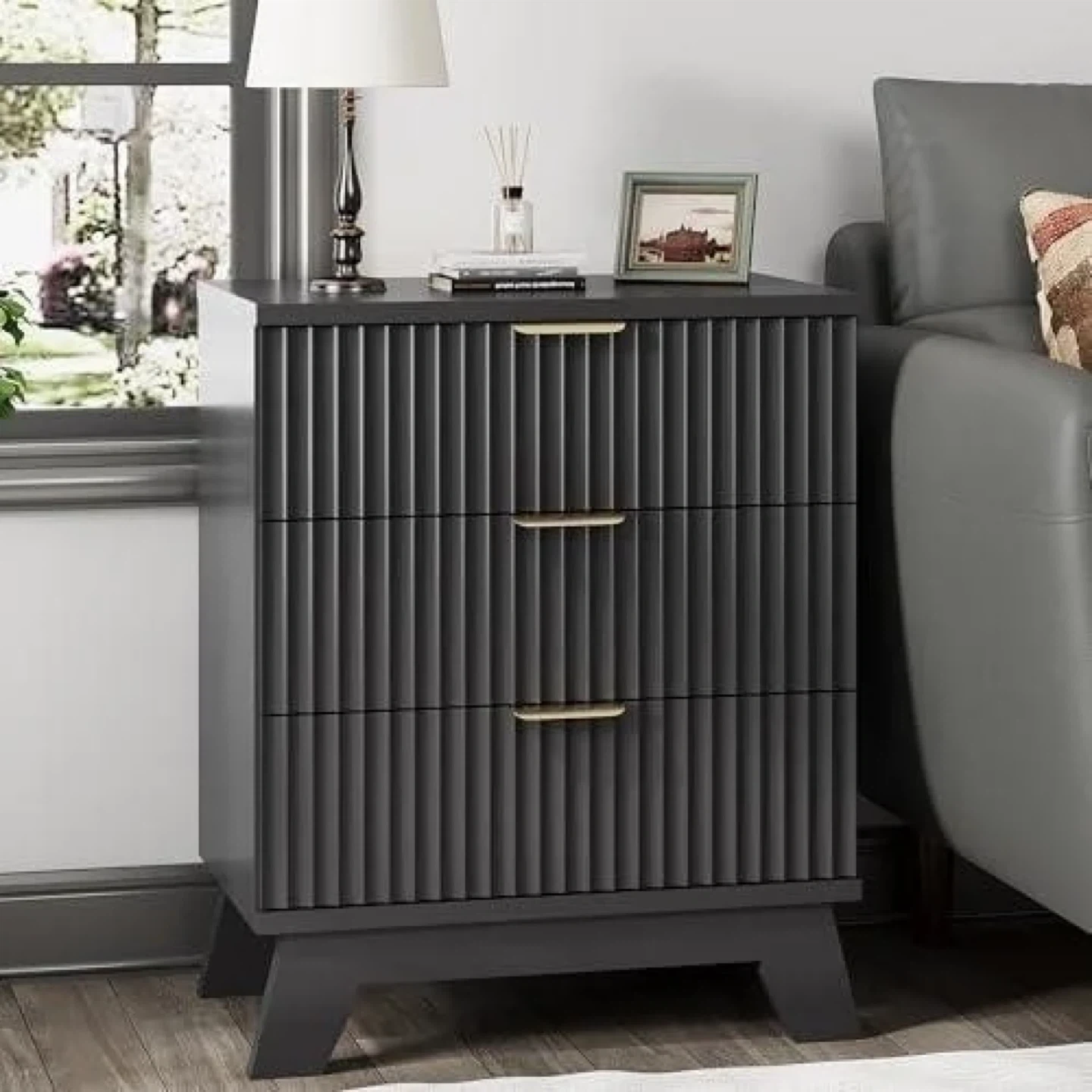 I'm selling a sleek black nightstand with three drawers! It's a stylish and functional piece for any bedroom. The nightstand features a modern design with vertical grooves on the drawer fronts and minimalist gold handles. It's in great condition and comes with the box!