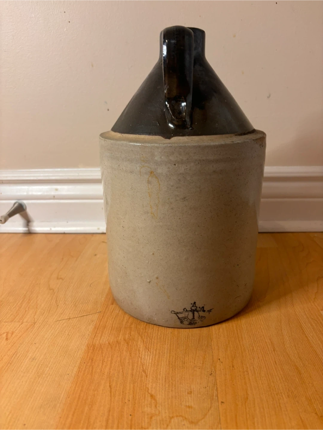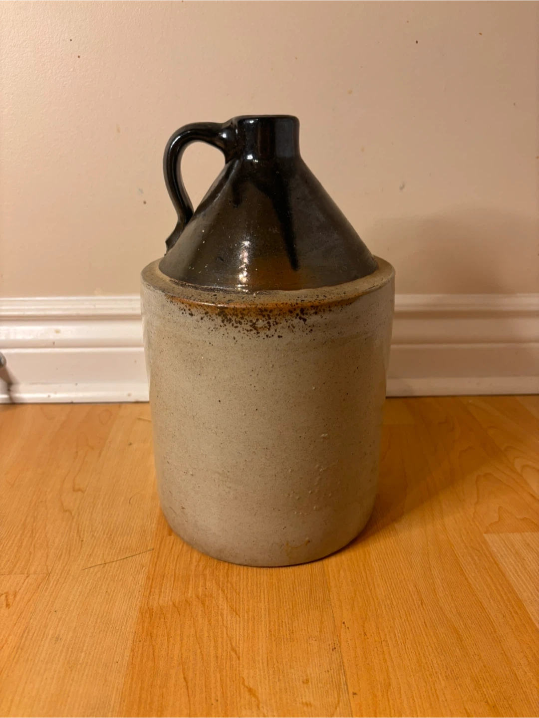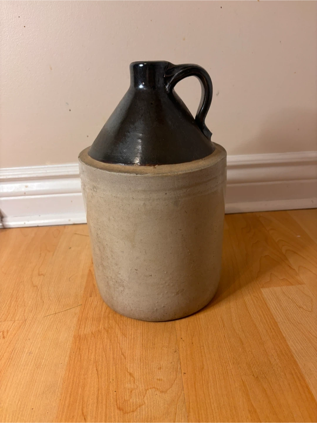 Originally used for whiskey, cider, or vinegar. Solid piece with intact handle. Great as a decorative accent, collector piece, or rustic farmhouse décor.