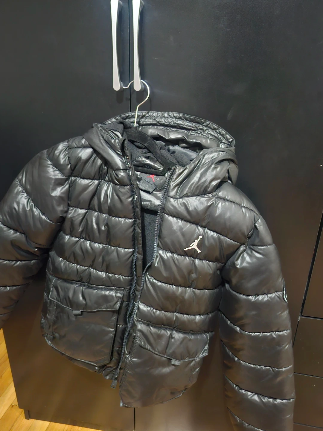 Selling a stylish black Jordan puffer jacket! It features the iconic Jordan logo and a comfortable, padded design. Perfect for staying warm and looking cool during colder weather.