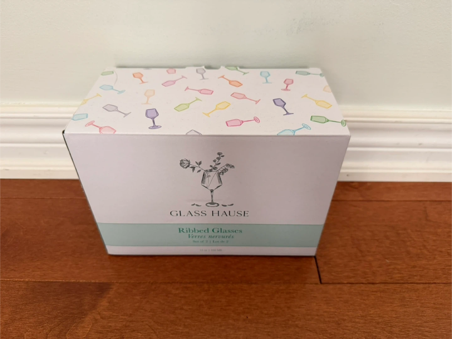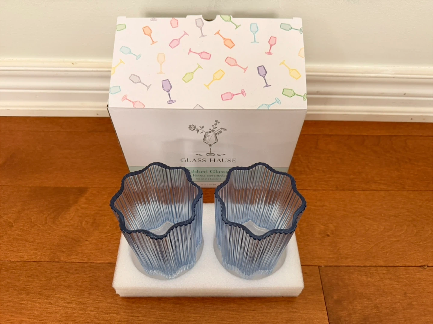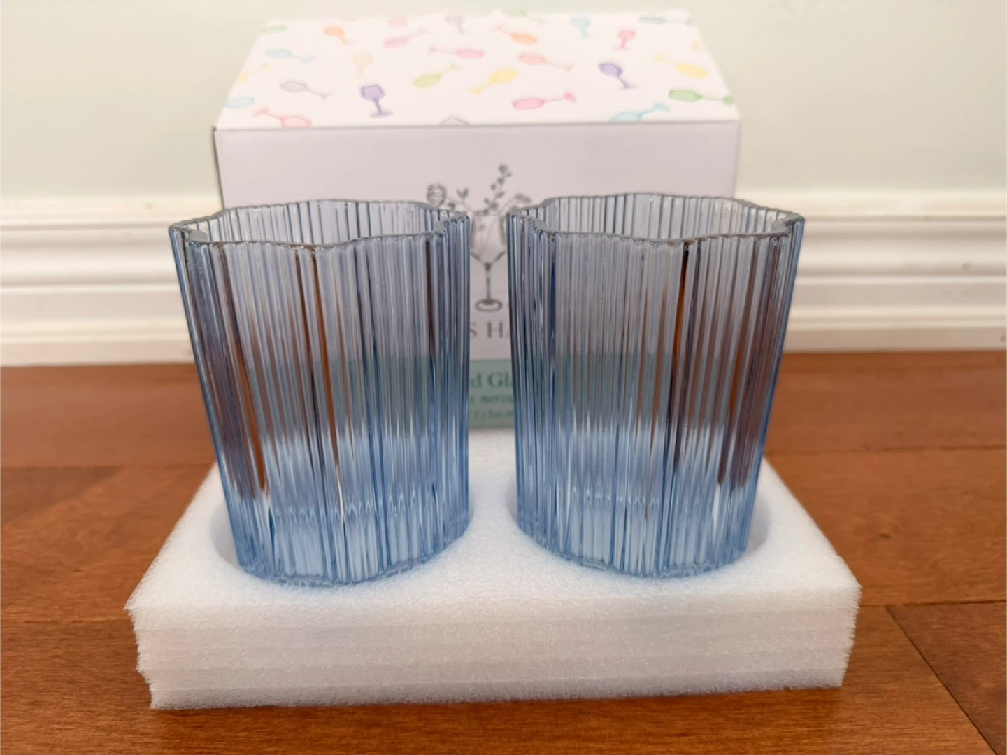 Selling a set of two Glass Hause ribbed glass tumblers in a lovely light blue colour! They come in their original box and are brand new. Perfect for adding a touch of elegance to your table setting.