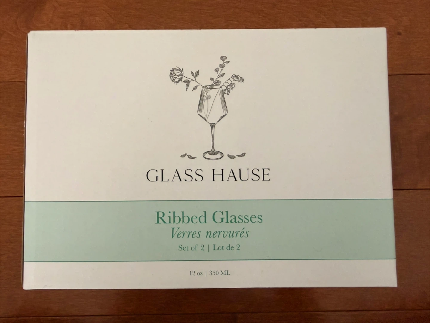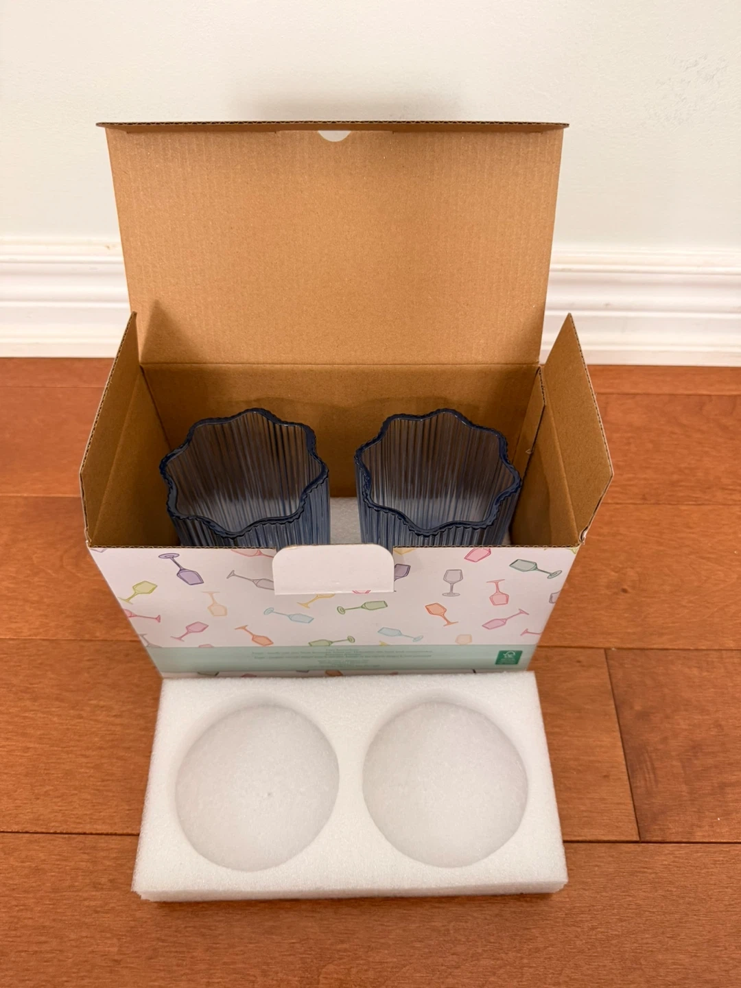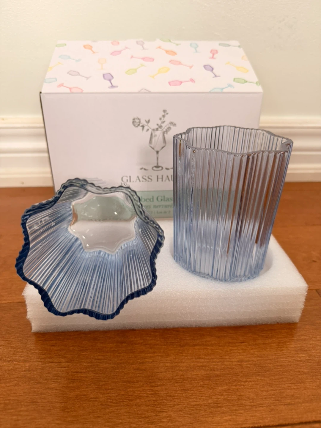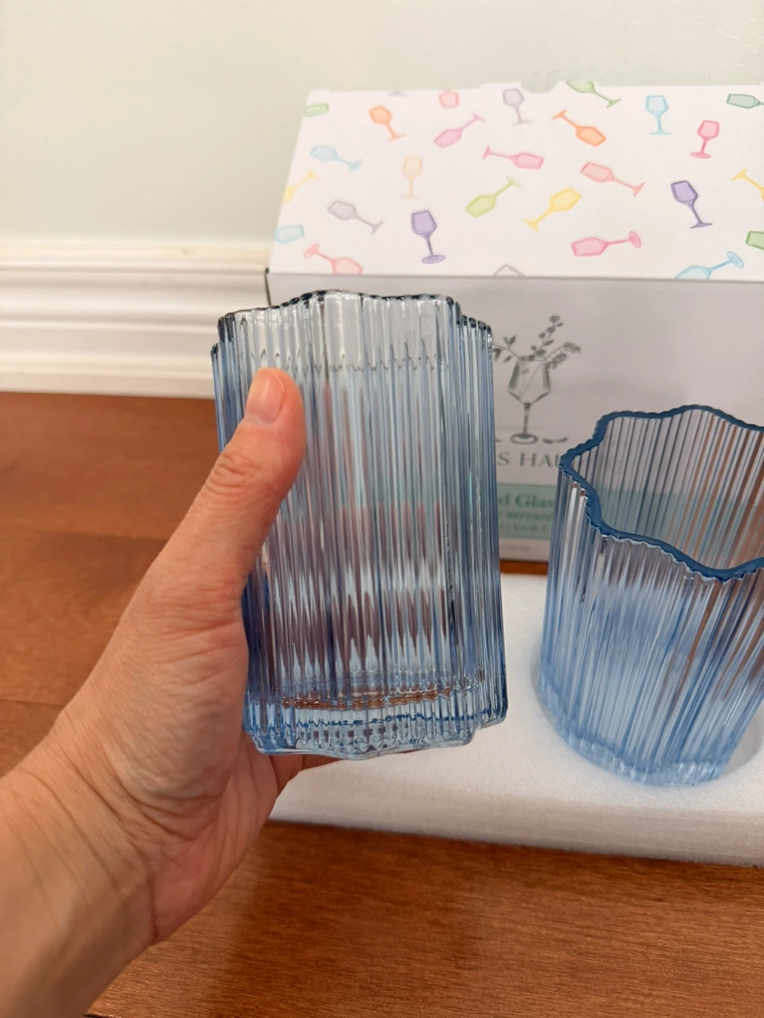 Selling a set of two Glass Hause ribbed glass tumblers in a lovely light blue colour! They come in their original box and are brand new. Perfect for adding a touch of elegance to your table setting.