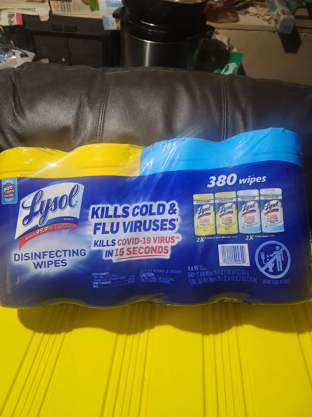 I'm selling a package of Lysol Disinfecting Wipes. This package contains 380 wipes and kills 99.9% of viruses and bacteria. They also kill cold and flu viruses, and COVID-19 in 15 seconds. Each package contains 4 packs of 95 wipes, with a total weight of 79.2 oz (4 lb 15.2 oz). Perfect for keeping your home clean and germ-free!