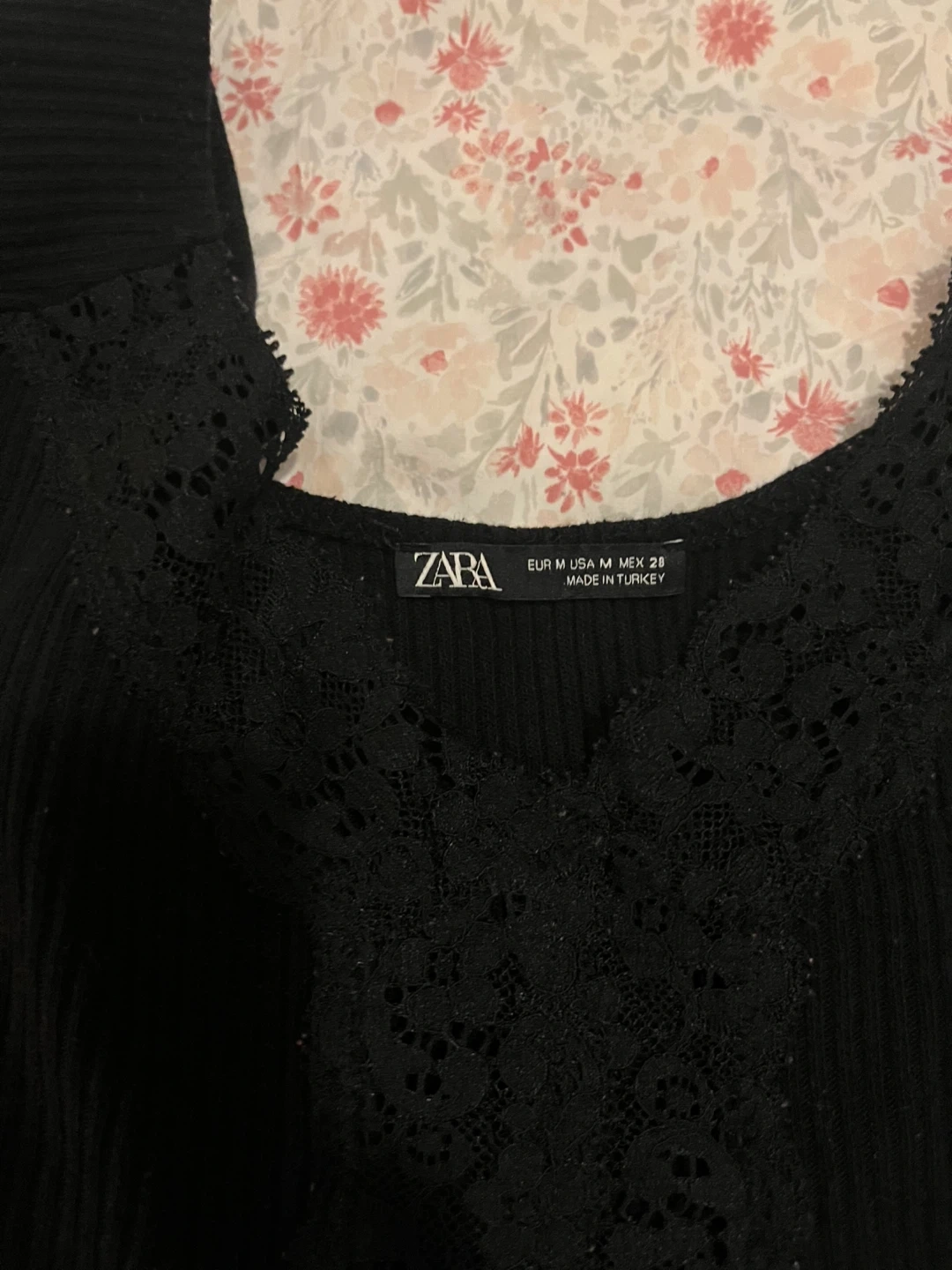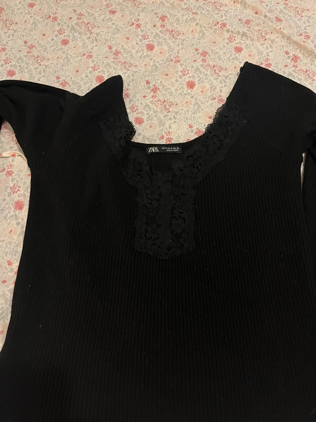 Selling a cute Zara black long-sleeve top with delicate lace trim! It's a size M and in great condition. Perfect for adding a touch of elegance to any outfit!