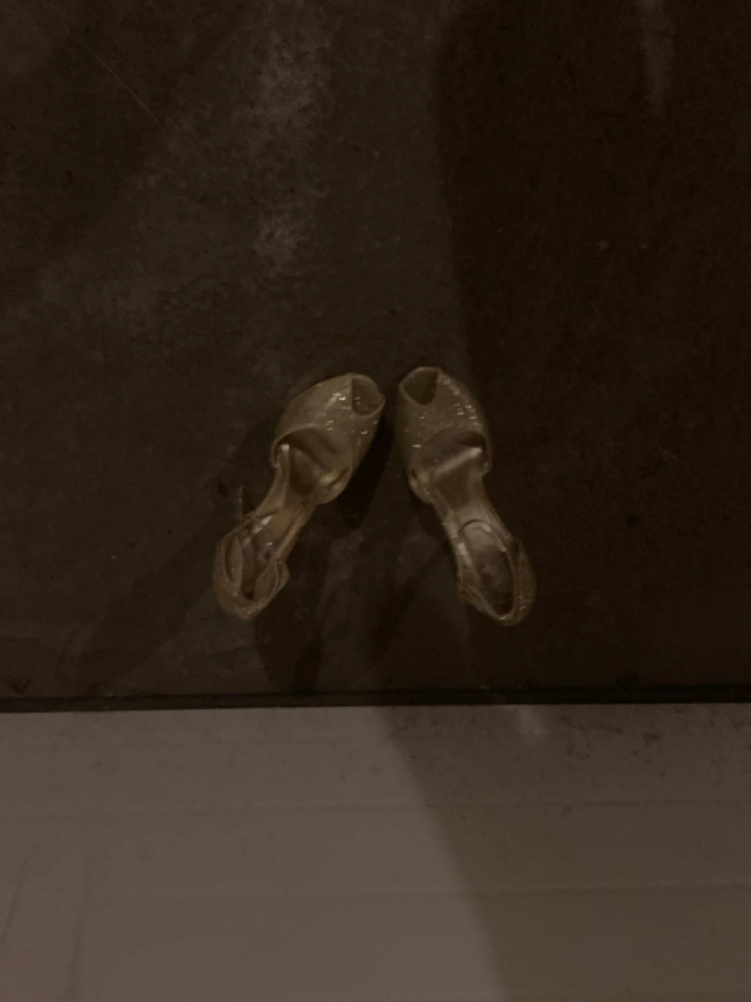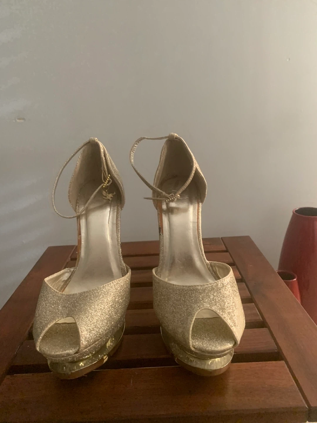 Selling a pair of gold glitter heels. They have a peep toe and ankle strap. The heels are stiletto style and decorated with rhinestones.