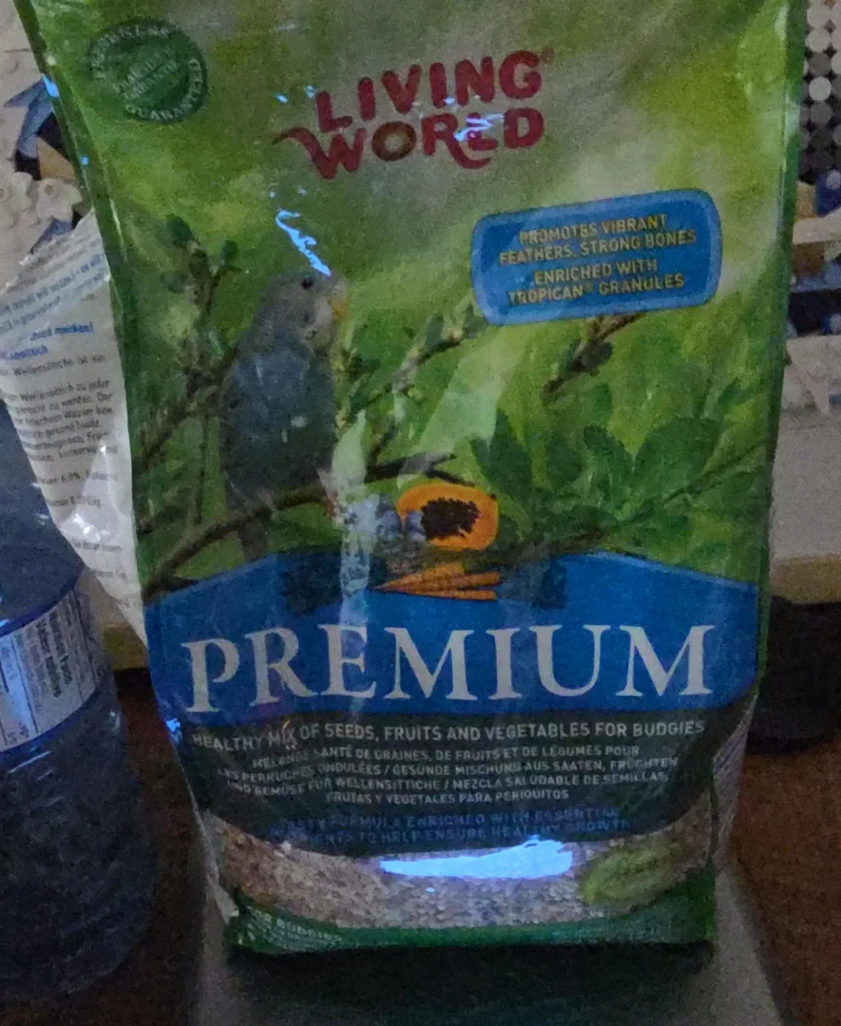 Selling a bag of Living World Premium bird food for budgies! It's a healthy mix of seeds, fruits, and vegetables. This food promotes vibrant feathers and strong bones, enriched with Tropican granules. Perfect for ensuring your budgie has a healthy growth!