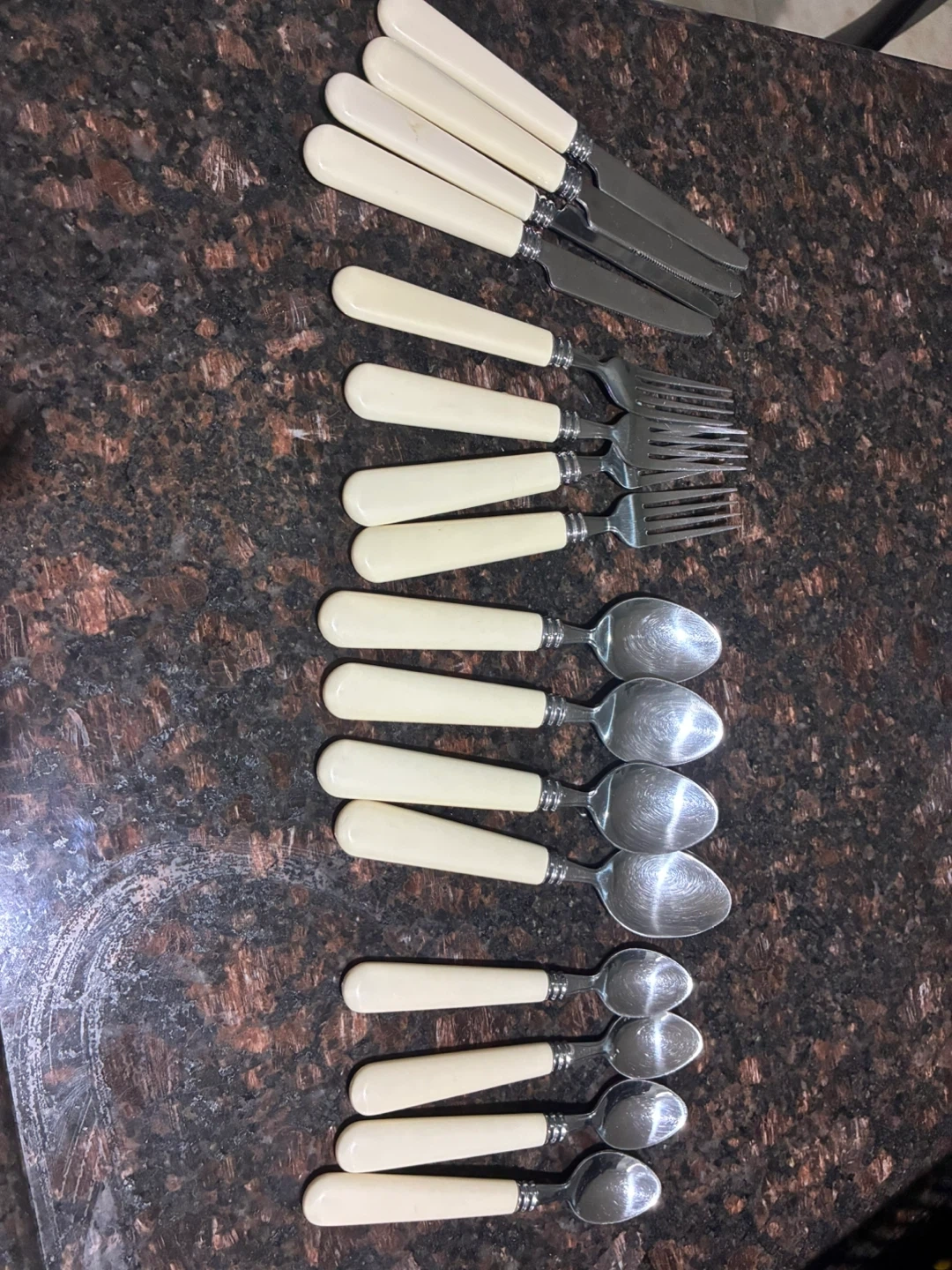Selling a vintage cutlery set with cream-coloured handles. The set includes knives, forks, spoons, and teaspoons. It's a charming addition to any dining table!