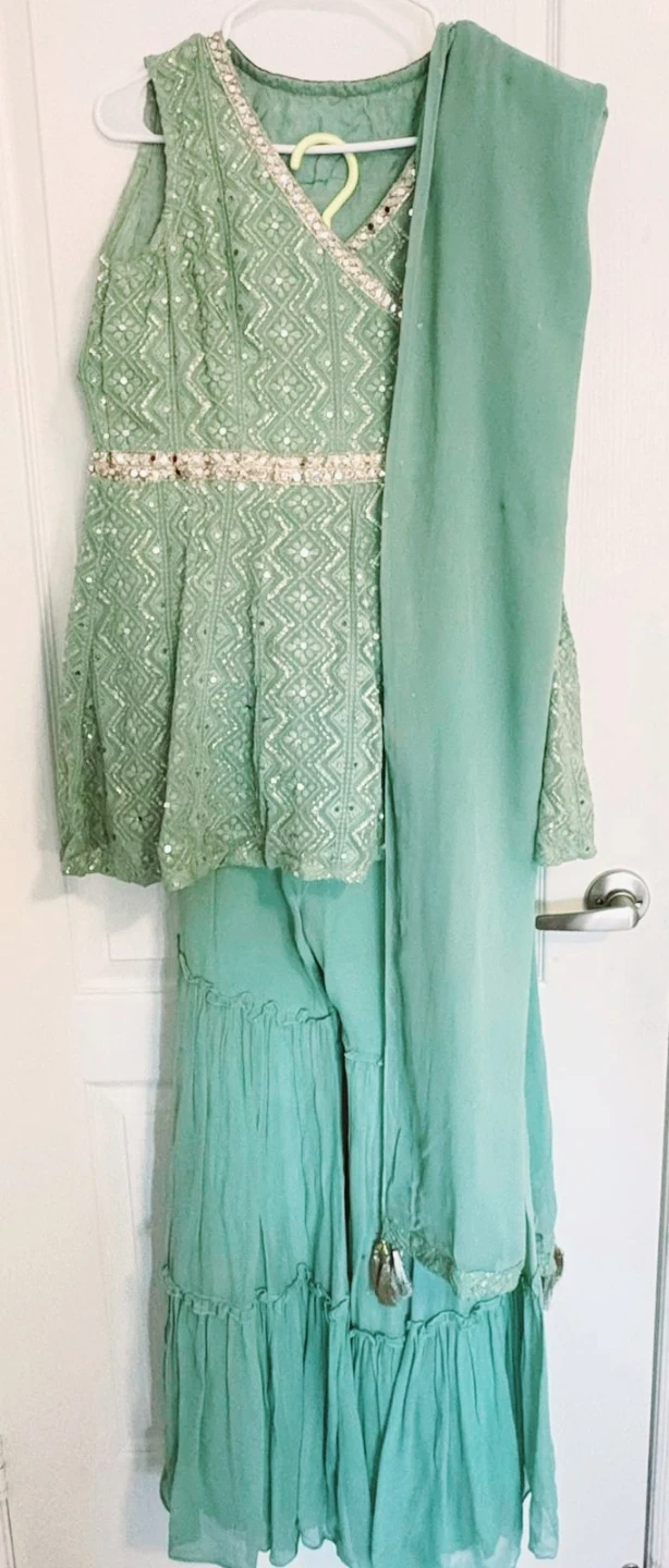 Selling beautiful 3 piece Mint Green Garara set with A lined sleeveless short shirt, garara and plain dupatta.