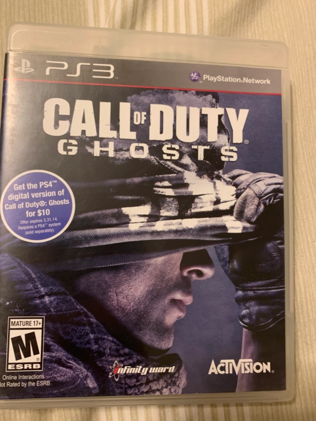 Selling a copy of Call of Duty: Ghosts for the PlayStation 3 (PS3). It's rated Mature 17+ by the ESRB and features online interactions.