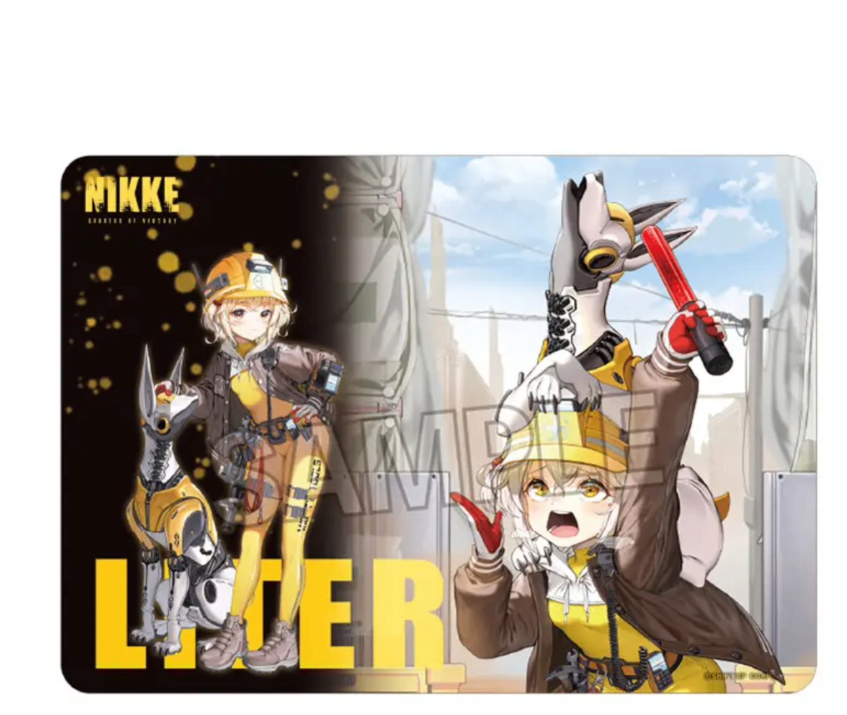 This playmat from Proof features a fun illustration of Liter (together with her robot canine companion Bolt) from "Goddess of Victory: Nikke"! It's just what you need to make your card games more entertaining; it'd make a great desk mat, too. Place your order today! Perfect for trading card games or your computer desk.