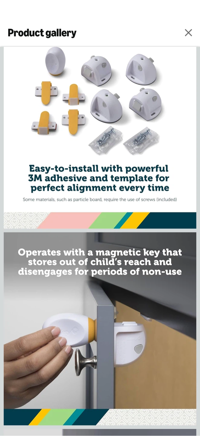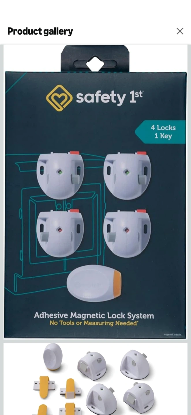 Keep your little one safe with this Safety 1st Adhesive Magnetic Lock System! It includes 4 locks and 1 key. Easy to install with powerful 3M adhesive and a template for perfect alignment every time. Operates with a magnetic key that stores out of a child's reach and disengages for periods of non-use. No tools or measuring needed!