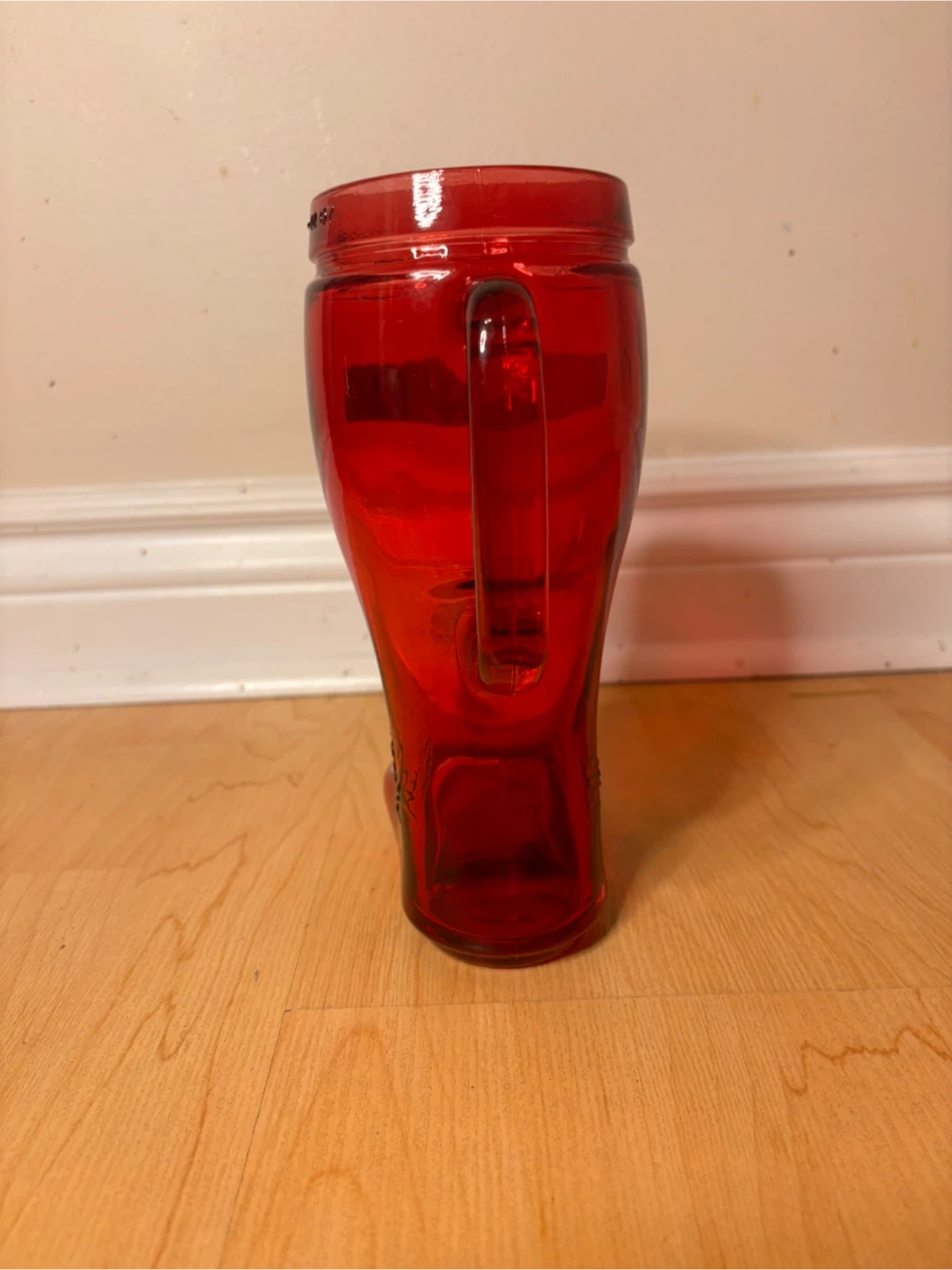 The mug is made of solid red glass with an integrated handle and boot-shaped base. It’s in good pre-owned condition, with no cracks or chips noted. Light surface wear may be present from normal use—see photos for details.