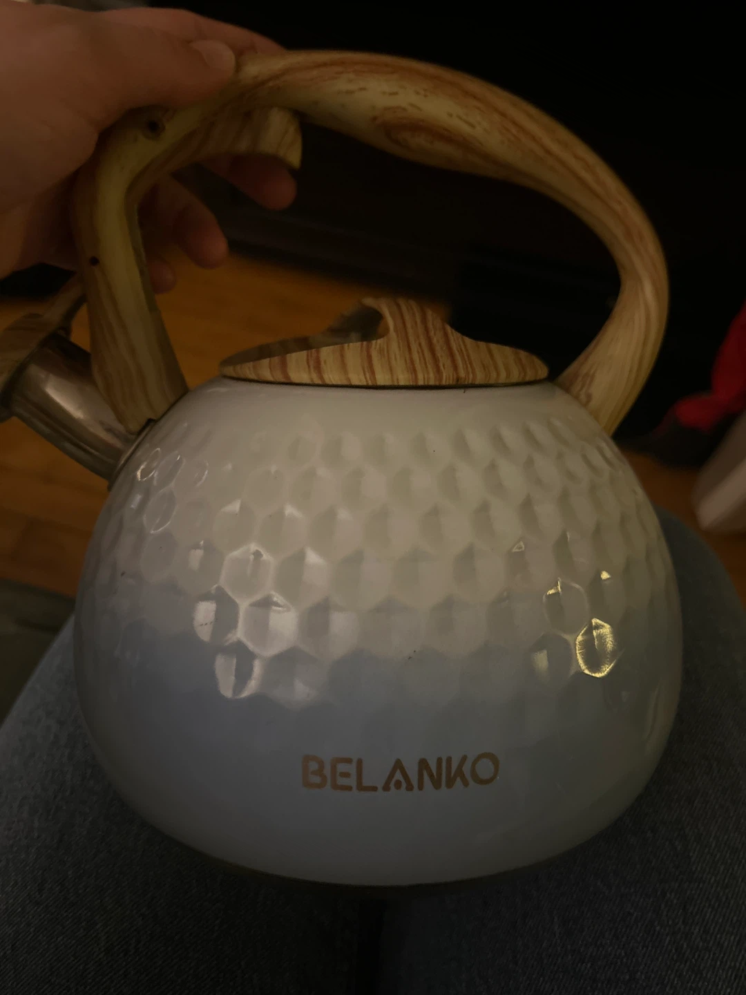 Selling a Belanko kettle in royal blue! It has a unique textured pattern and a wooden-look handle. It has a couple small scuffs but otherwise in great shape.