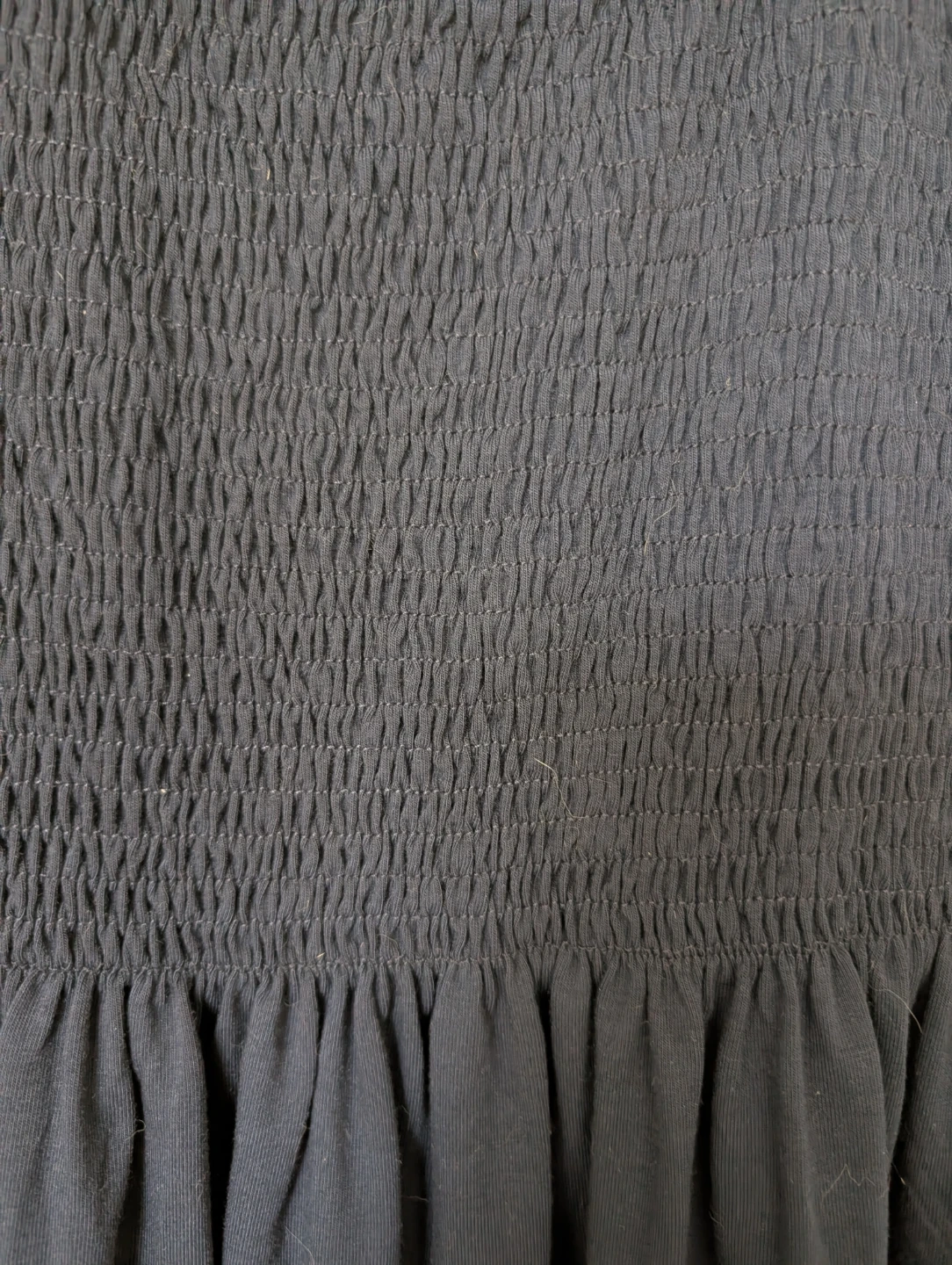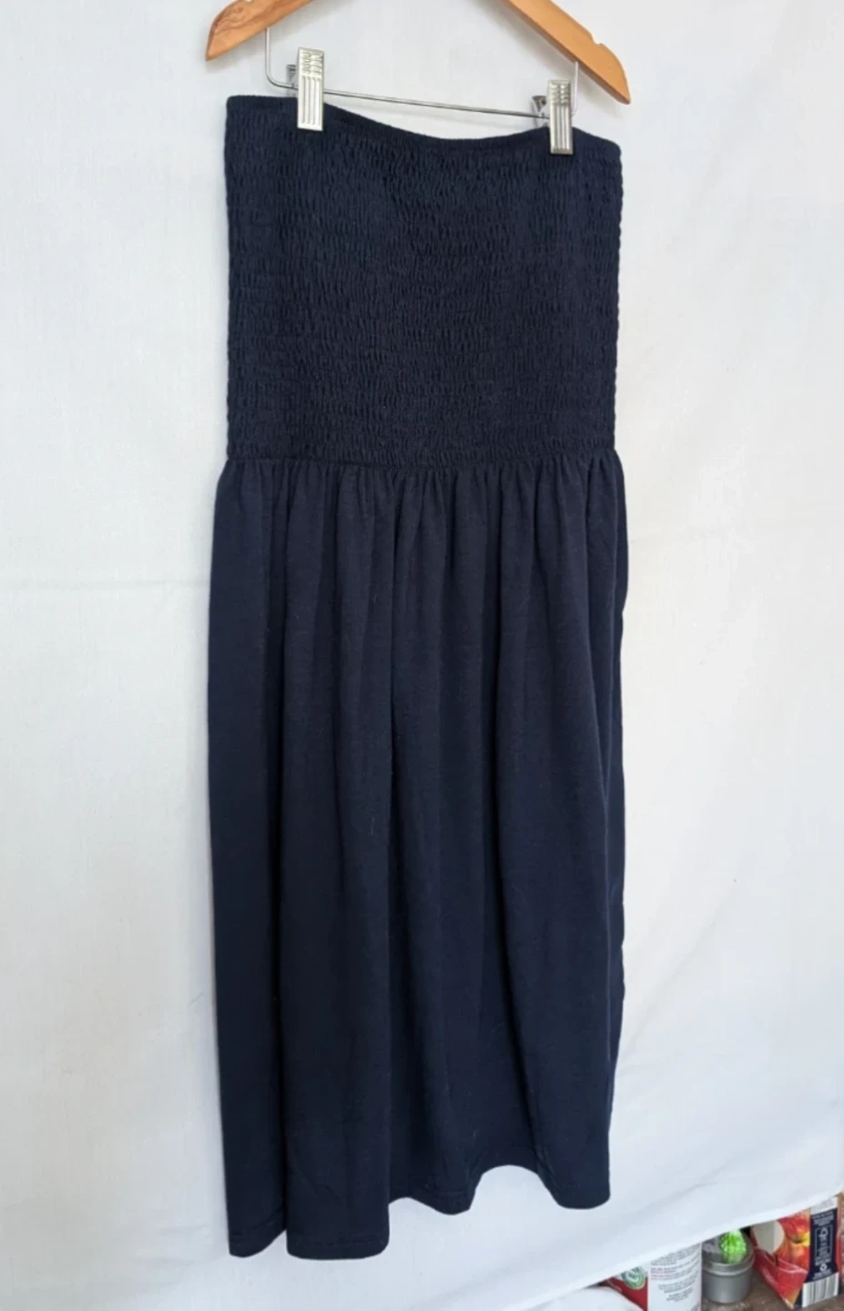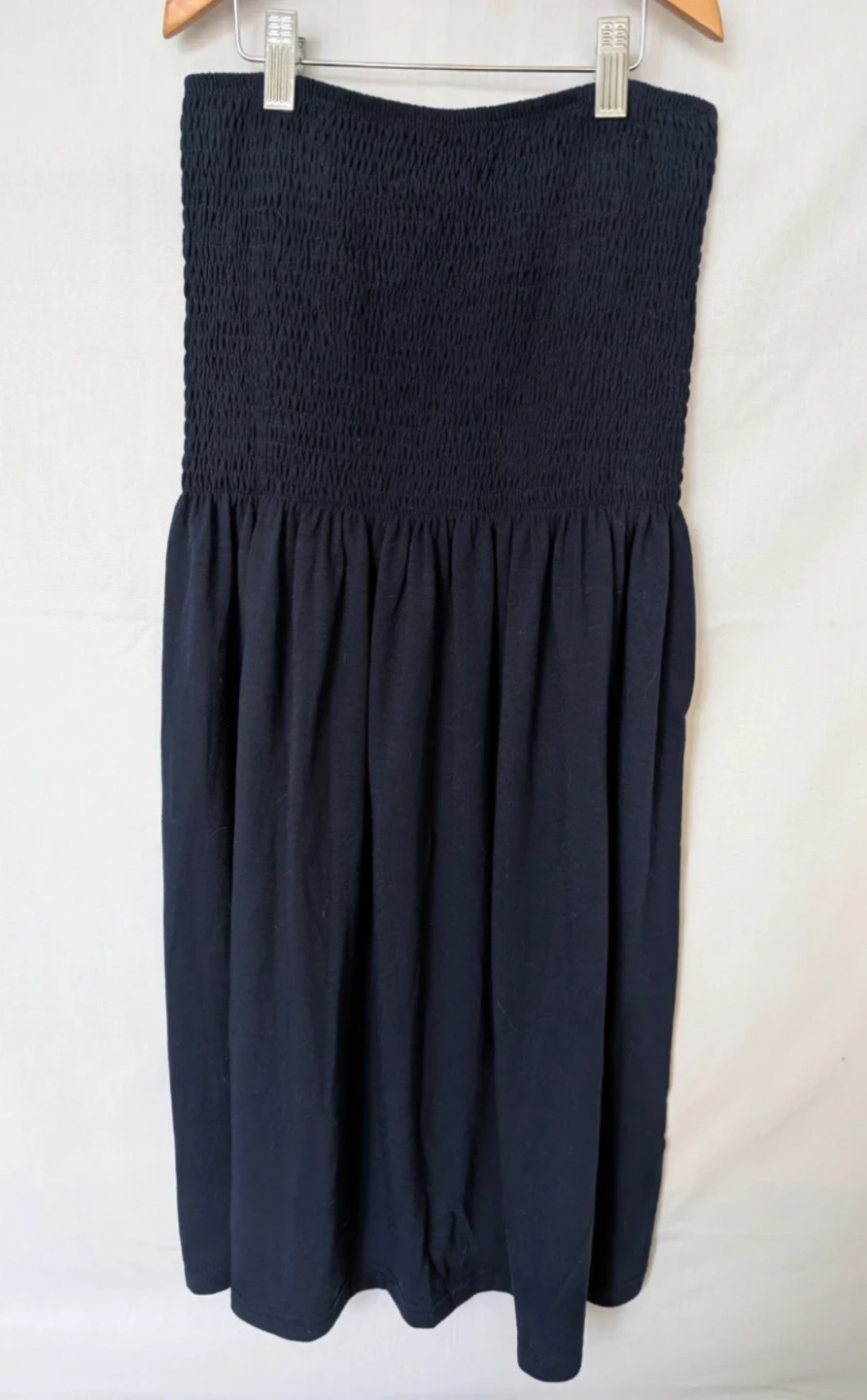A simple, navy, shirred fabric, casual, strapless dress.