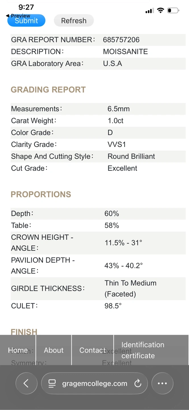 Selling a lovely moissanite ring! It's made of 925 silver and features a 6.5mm stone. The stone is D colour grade with VVS1 clarity. The cut grade is excellent, and the shape is round brilliant. A beautiful piece!