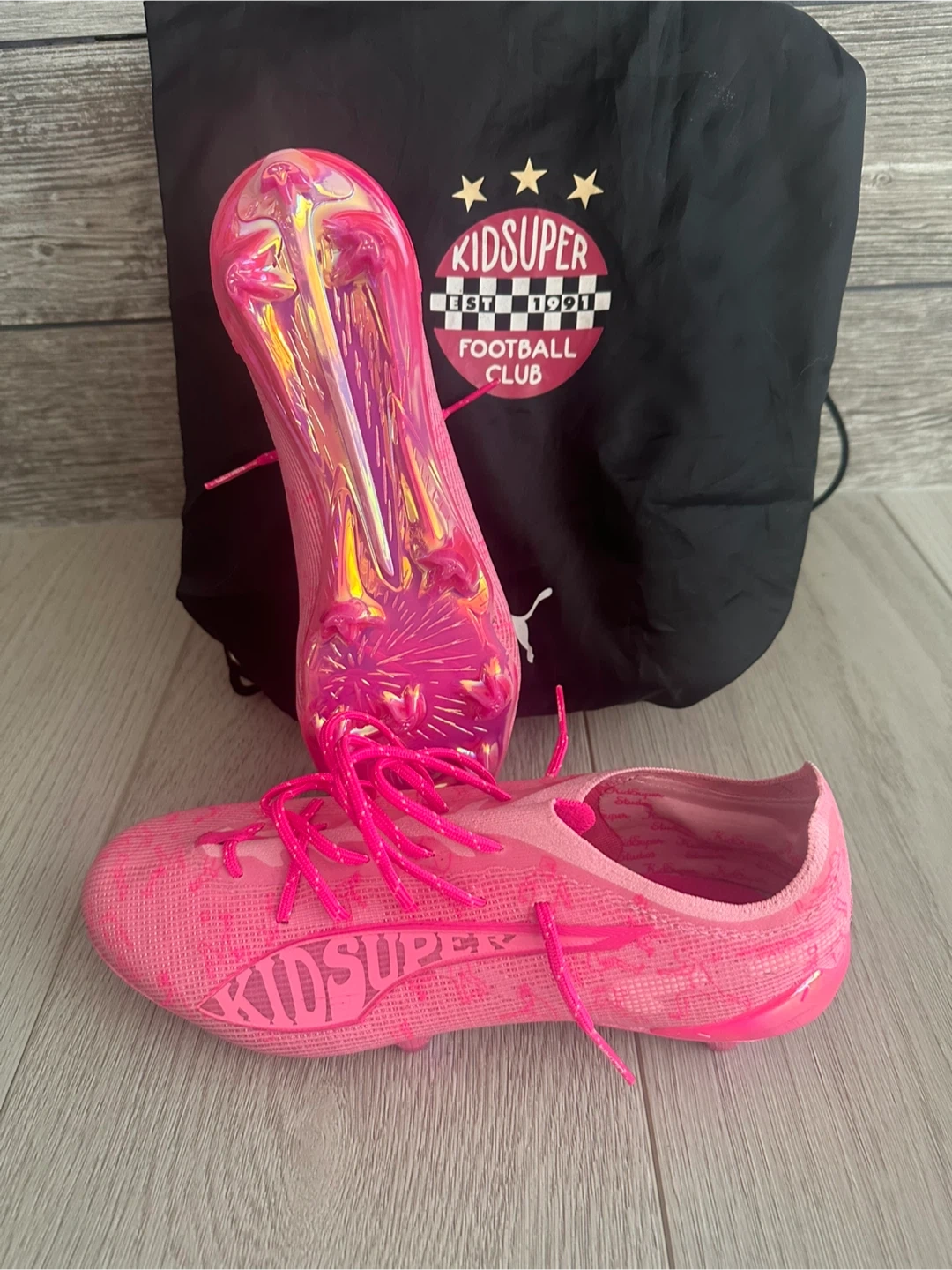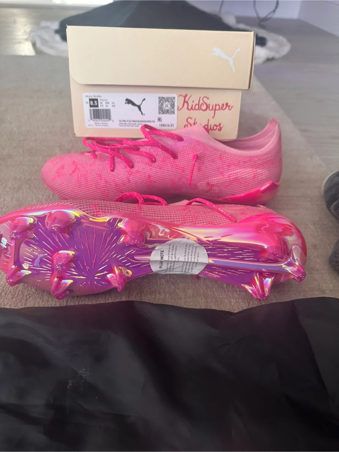 Puma Ultra 5.1 x KidSuper FG soccer cleats in US adult size 8.5! These are a vibrant pink colour and come with the original box and bag. Currently sold out . A stylish choice for your next game! Was ordered from soccer world as a gift and too tight cannot return. Ready for someone else to enjoy.