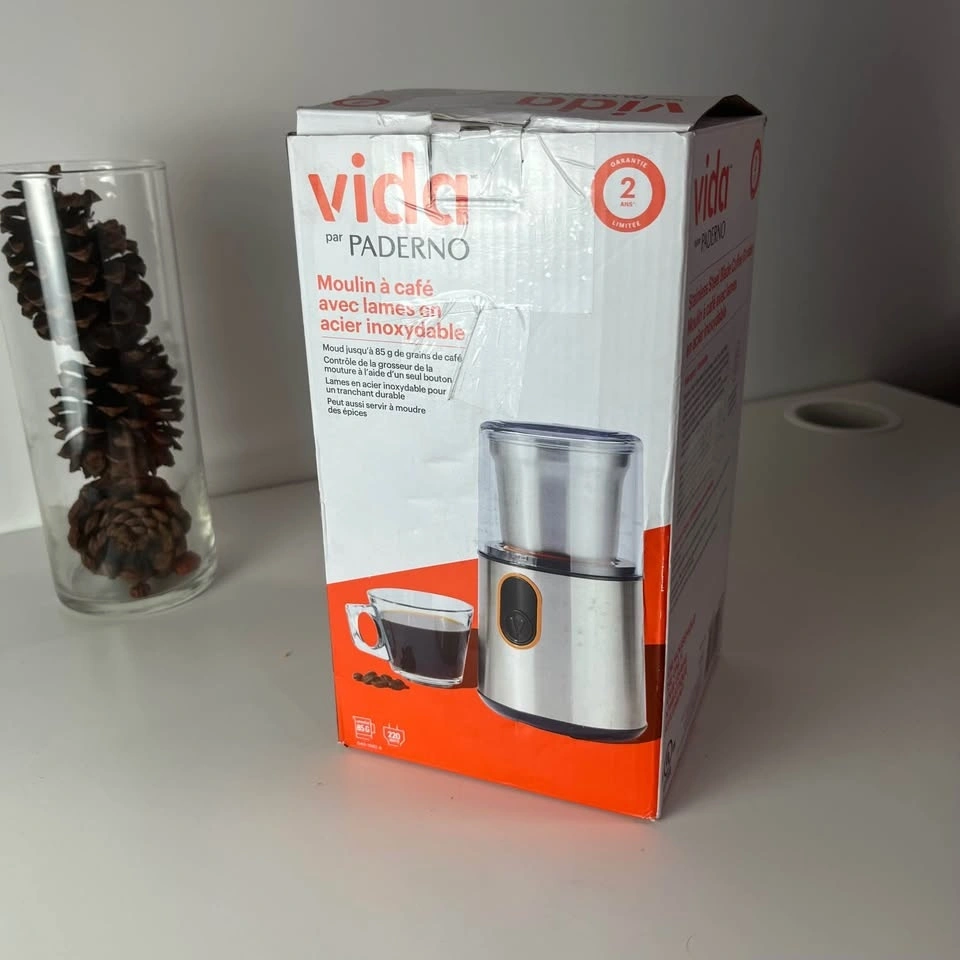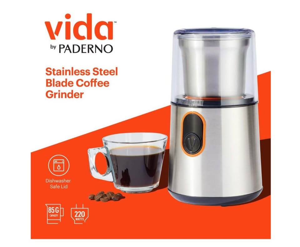 Start your day right with the Vida by PADERNO Coffee Grinder for a delightful coffee experience every time. Equipped with a durable 304 stainless steel blade, this simple, one-touch grinder ensures precision and consistency in grinding your coffee beans to perfection.