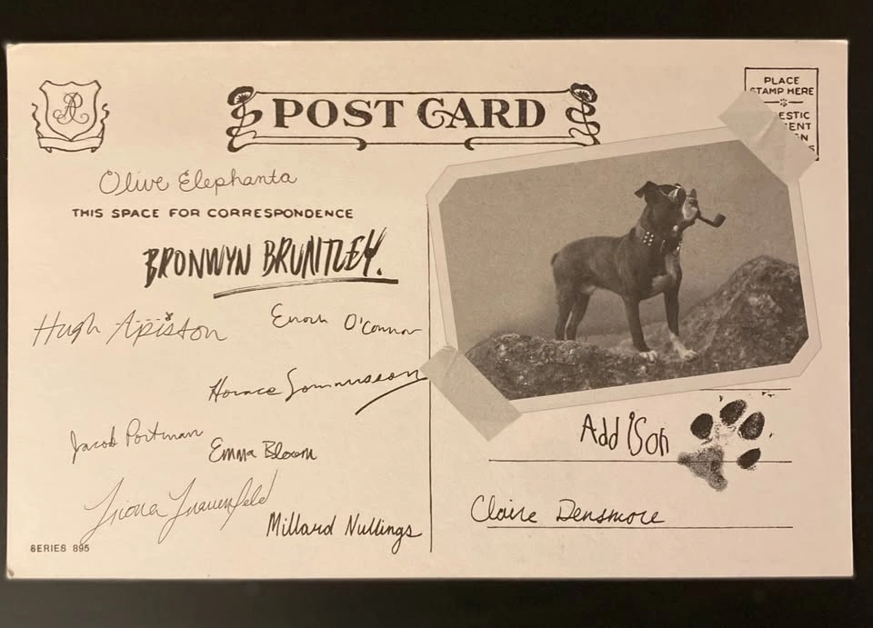 Box set is damaged, unfortunately, but it comes with a postcard signed by all the characters in the book on one side, and character pictures on the other.