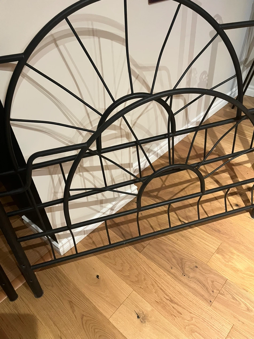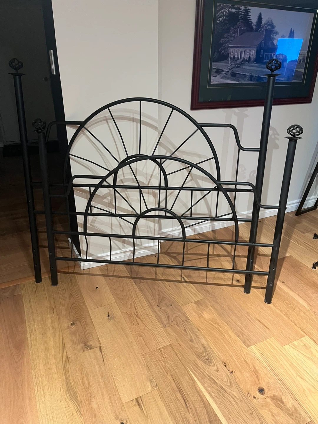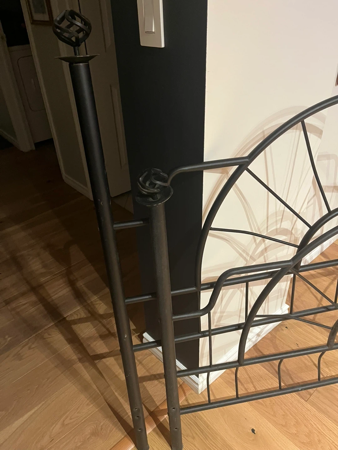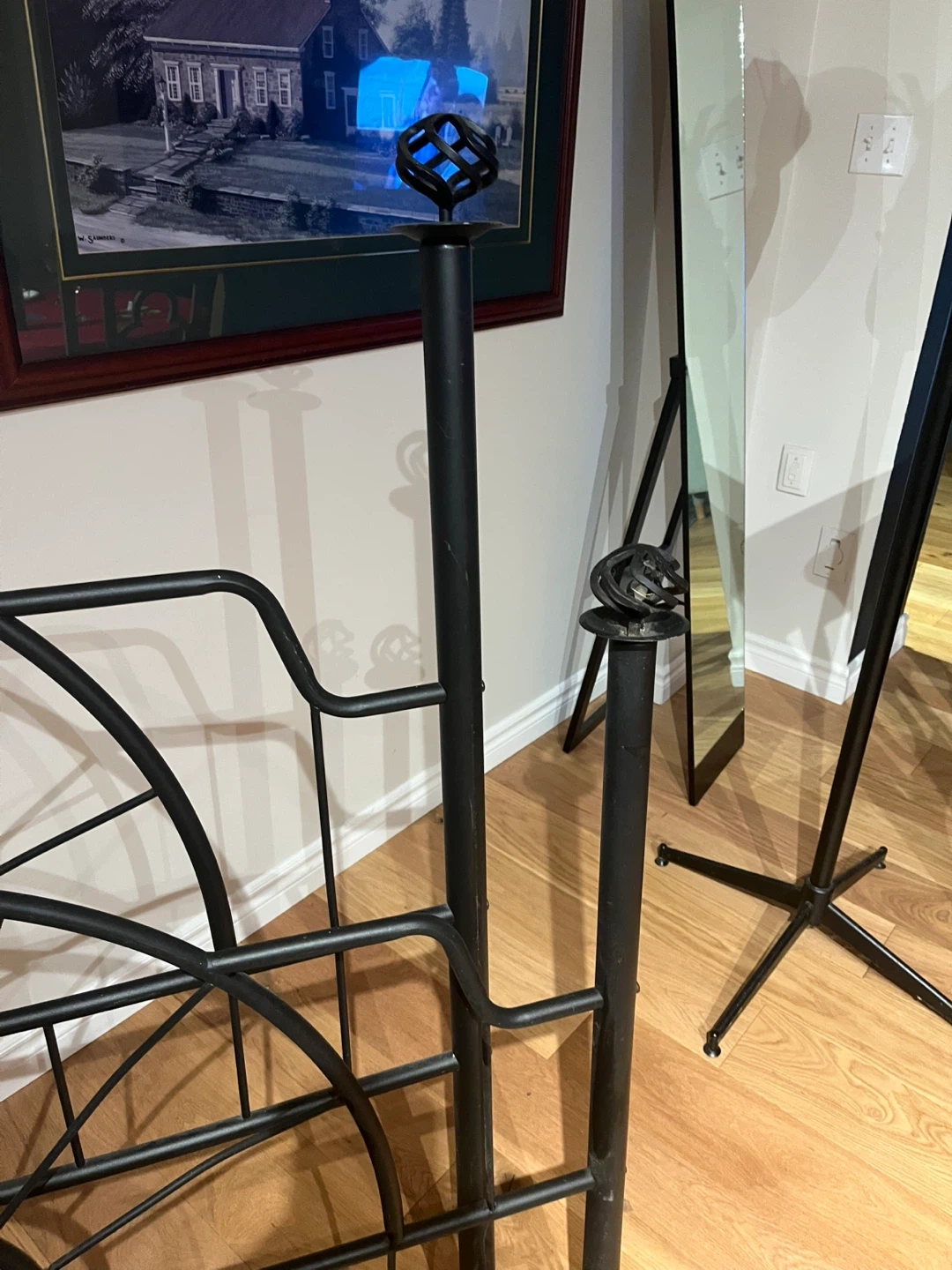 Selling a black metal bed frame. It's in good condition and ready for a new home. The frame features a unique design with decorative finials on the posts. Perfect for adding a touch of elegance to your bedroom!