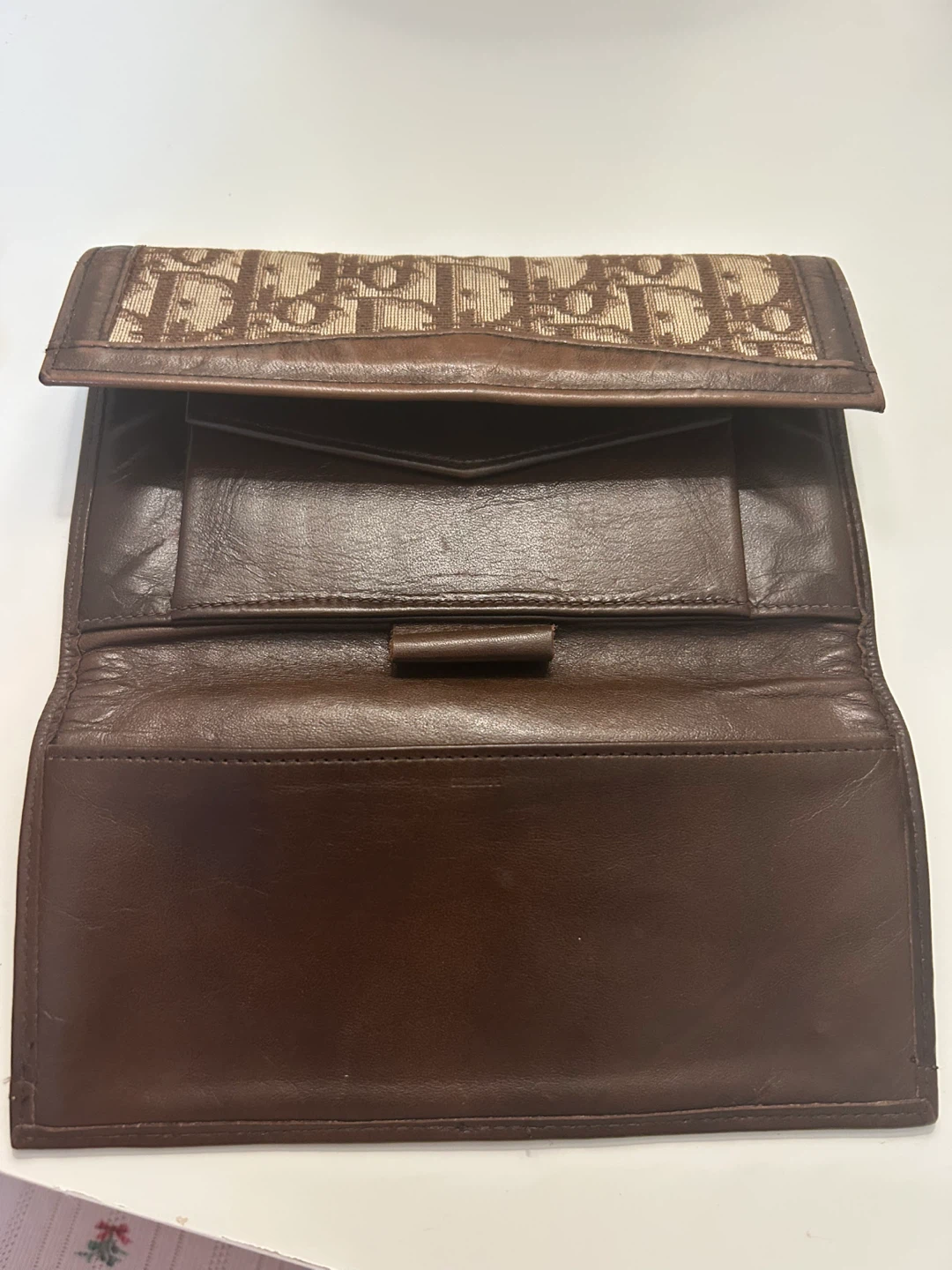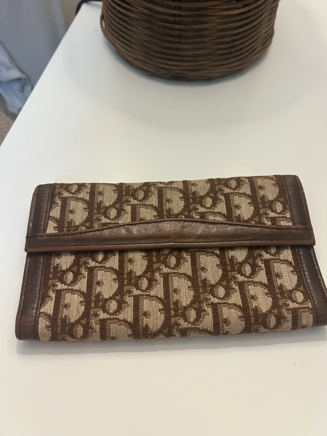Selling a Christian Dior checkbook wallet in good condition. It has the classic Dior Oblique pattern in brown and beige. Perfect for keeping your essentials organized!