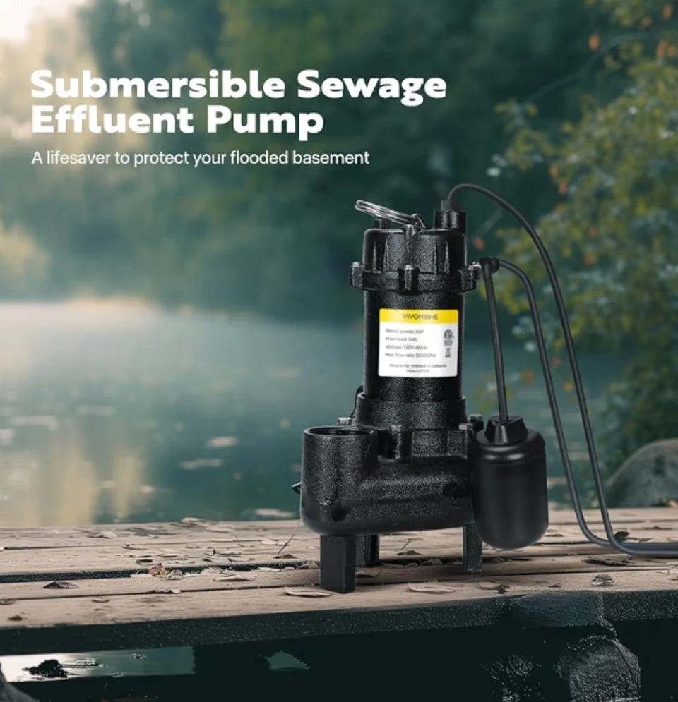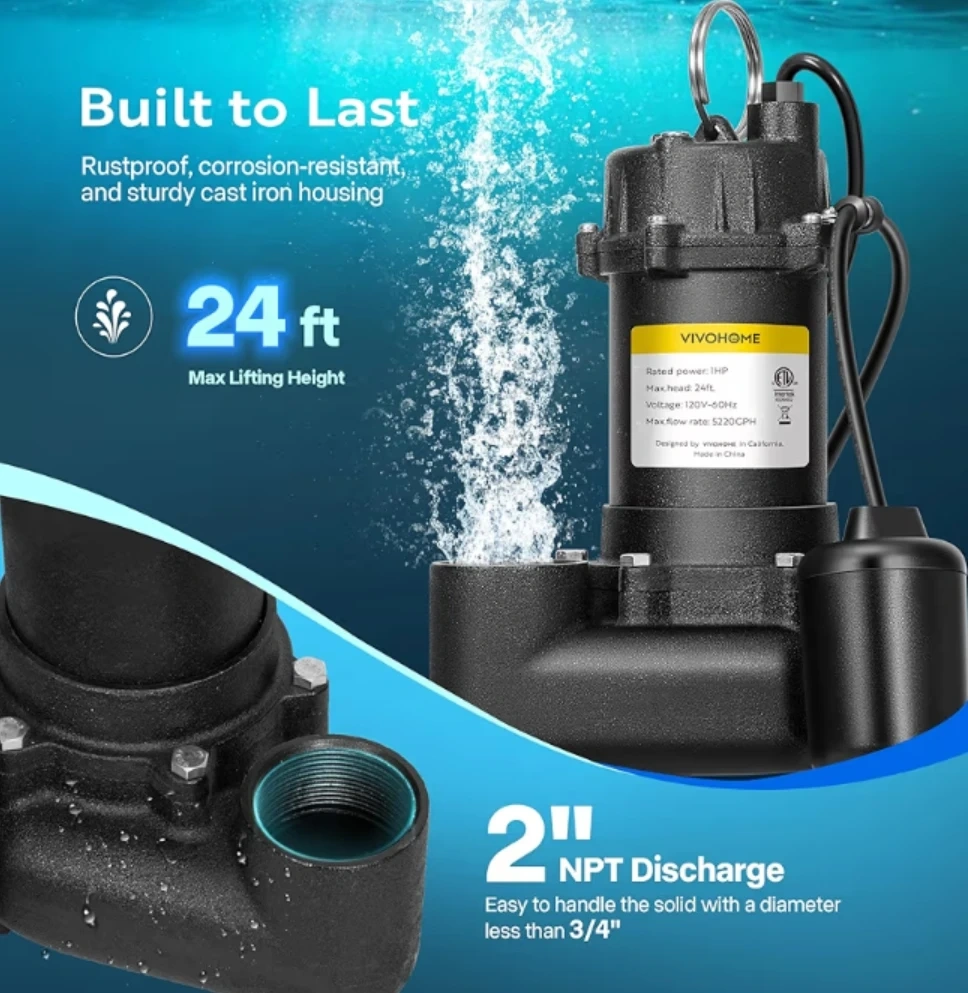 This VIVOHOME submersible sewage effluent pump is designed to protect your basement from flooding. It features a rustproof, corrosion-resistant, and sturdy cast iron housing. The pump has a 2" NPT discharge and can handle solids with a diameter less than 3/4".