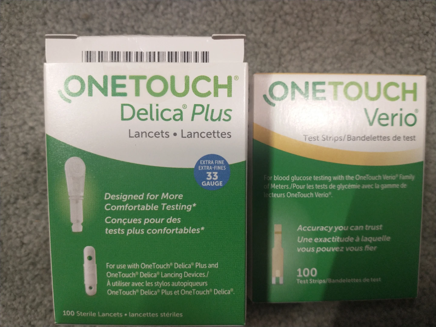 Selling a box of OneTouch Delica Plus lancets and a box of OneTouch Verio test strips. Both are designed for use with OneTouch devices. The Delica Plus lancets are extra fine and designed for more comfortable testing. The Verio test strips are for blood glucose testing with the OneTouch Verio family of meters.