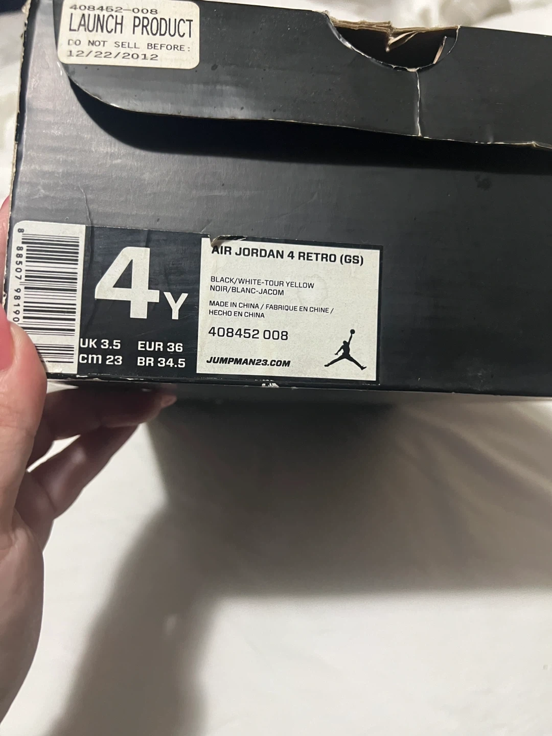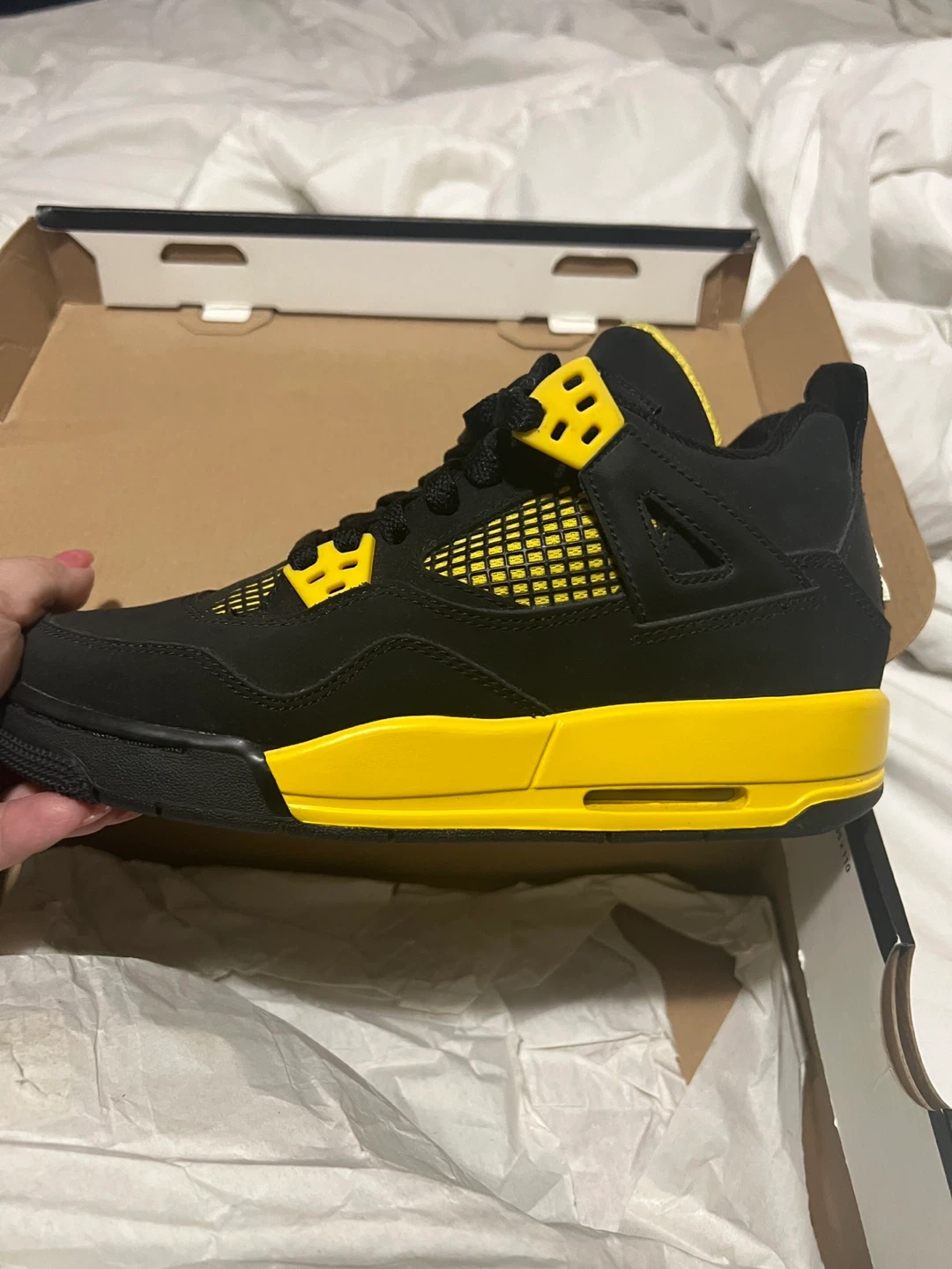 Selling a pair of Air Jordan 4 Retro (GS) in black, white, and tour yellow. The size is 4Y. Comes with the box!