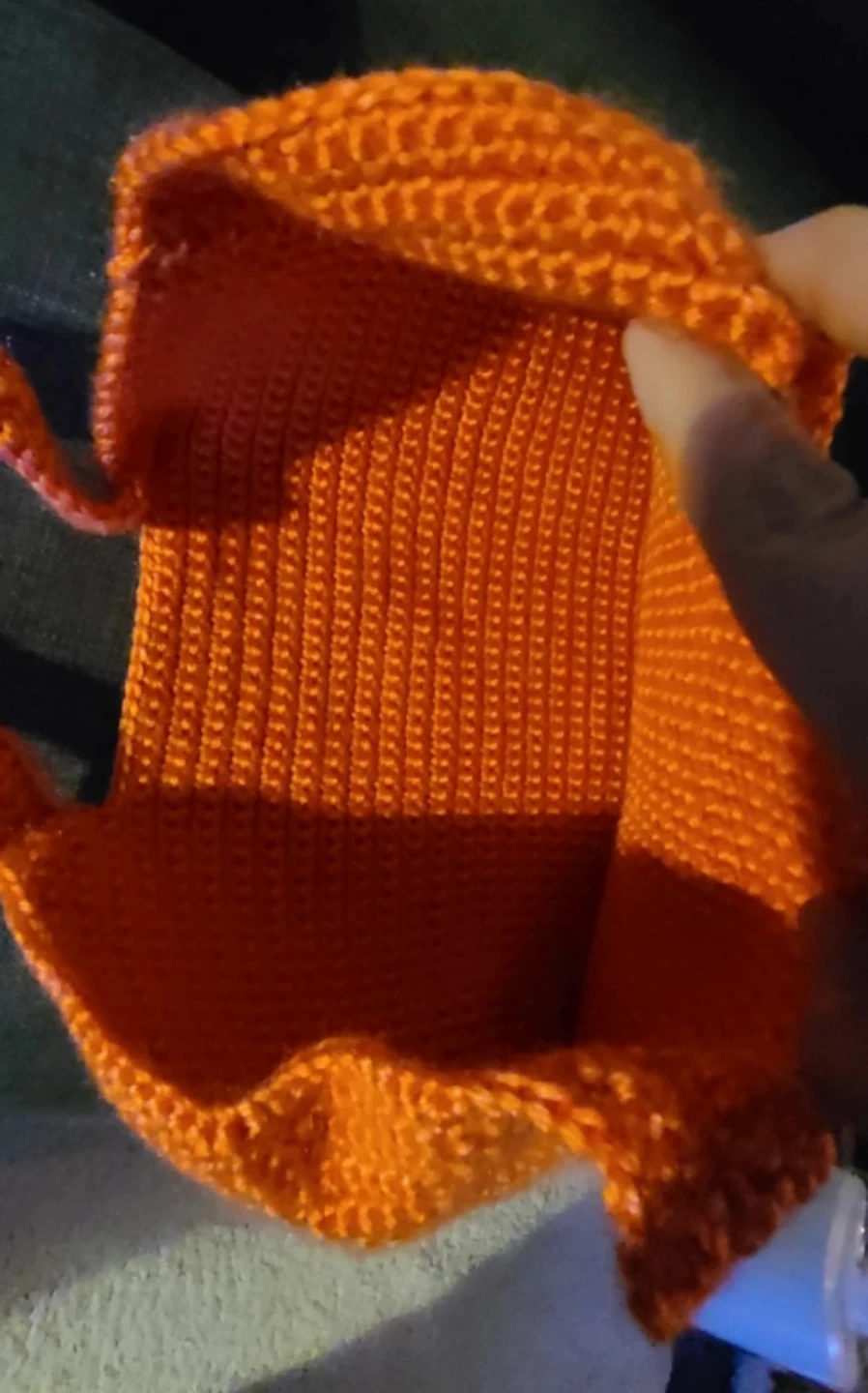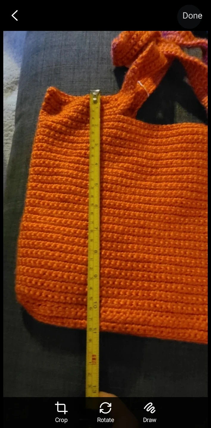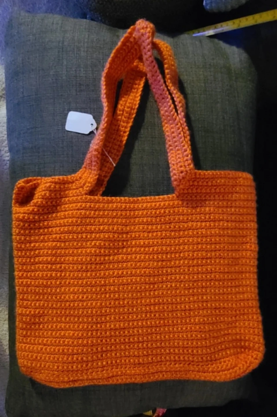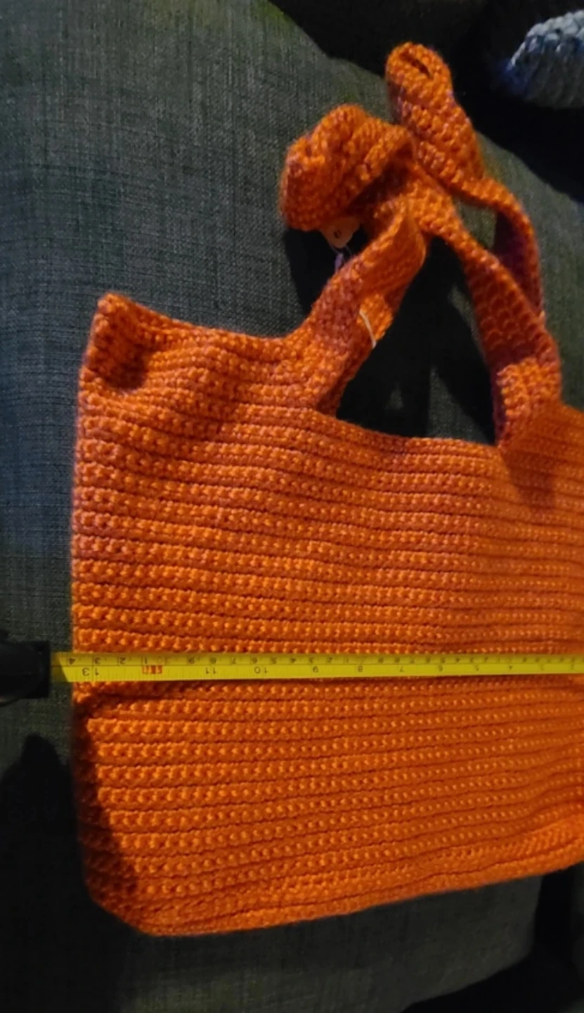 Check out this handmade crochet tote bag! It's a vibrant orange colour and is perfect for carrying your everyday essentials. The bag measures approximately 12 inches in height and 13 inches in width.