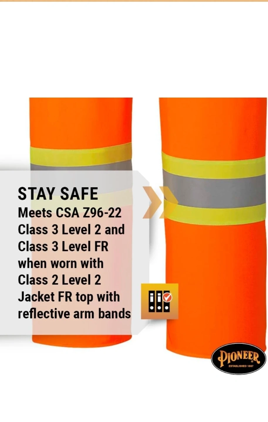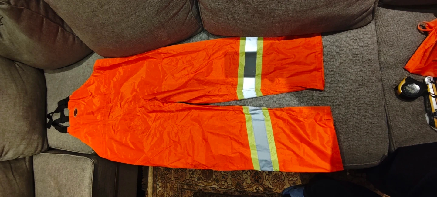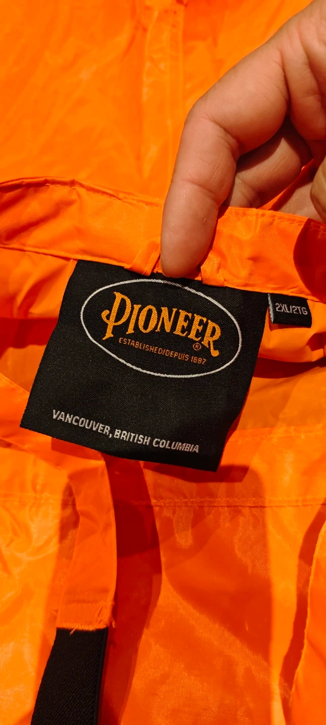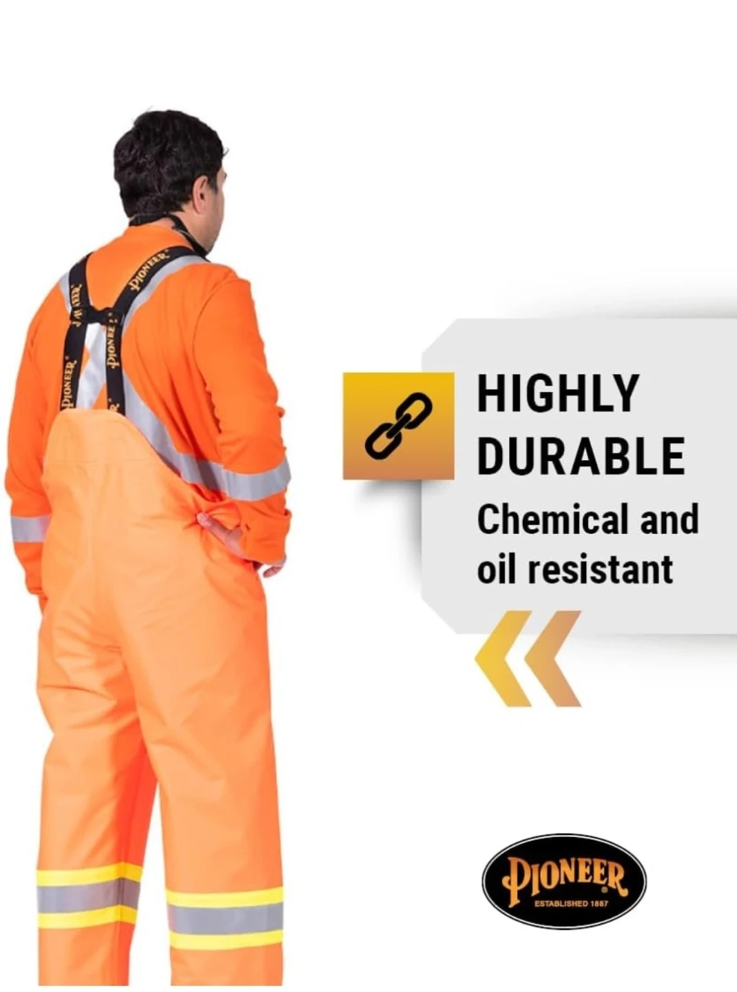 Selling a pair of Pioneer rain bib pants in bright orange! They're a size 2XL/2TG and have reflective stripes near the ankles for visibility. Great for outdoor work or activities where you need to stay dry