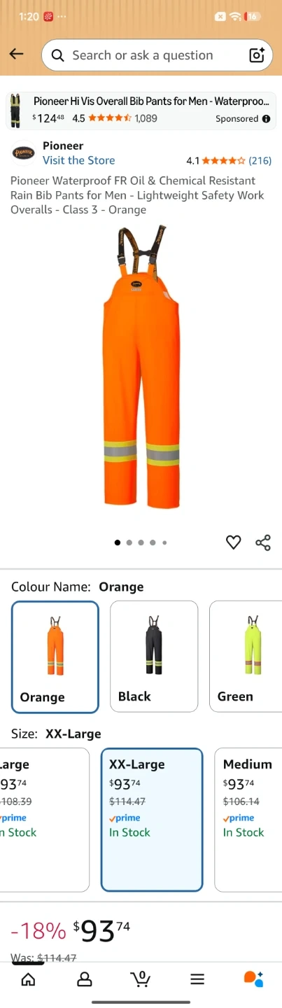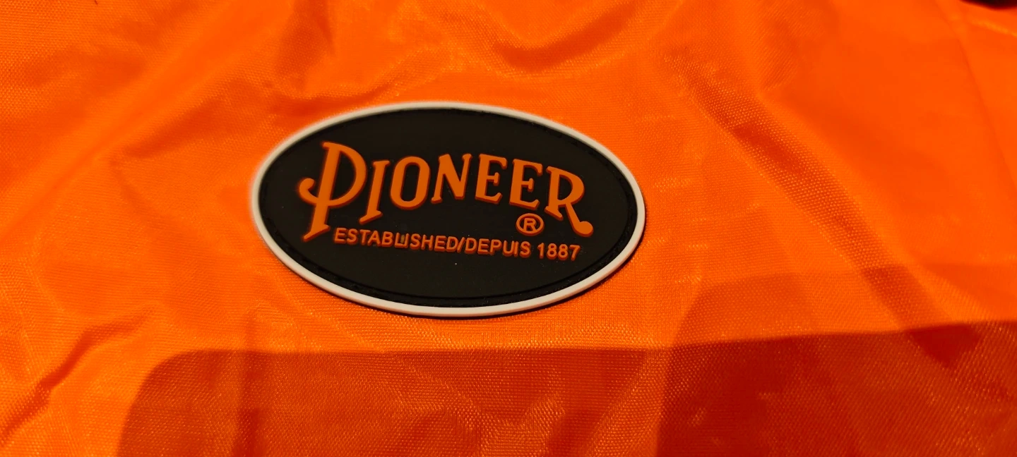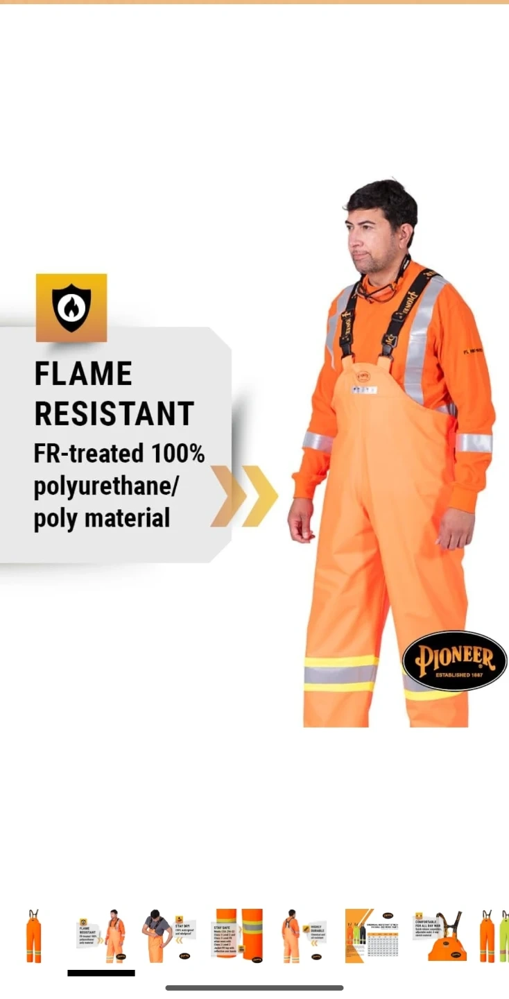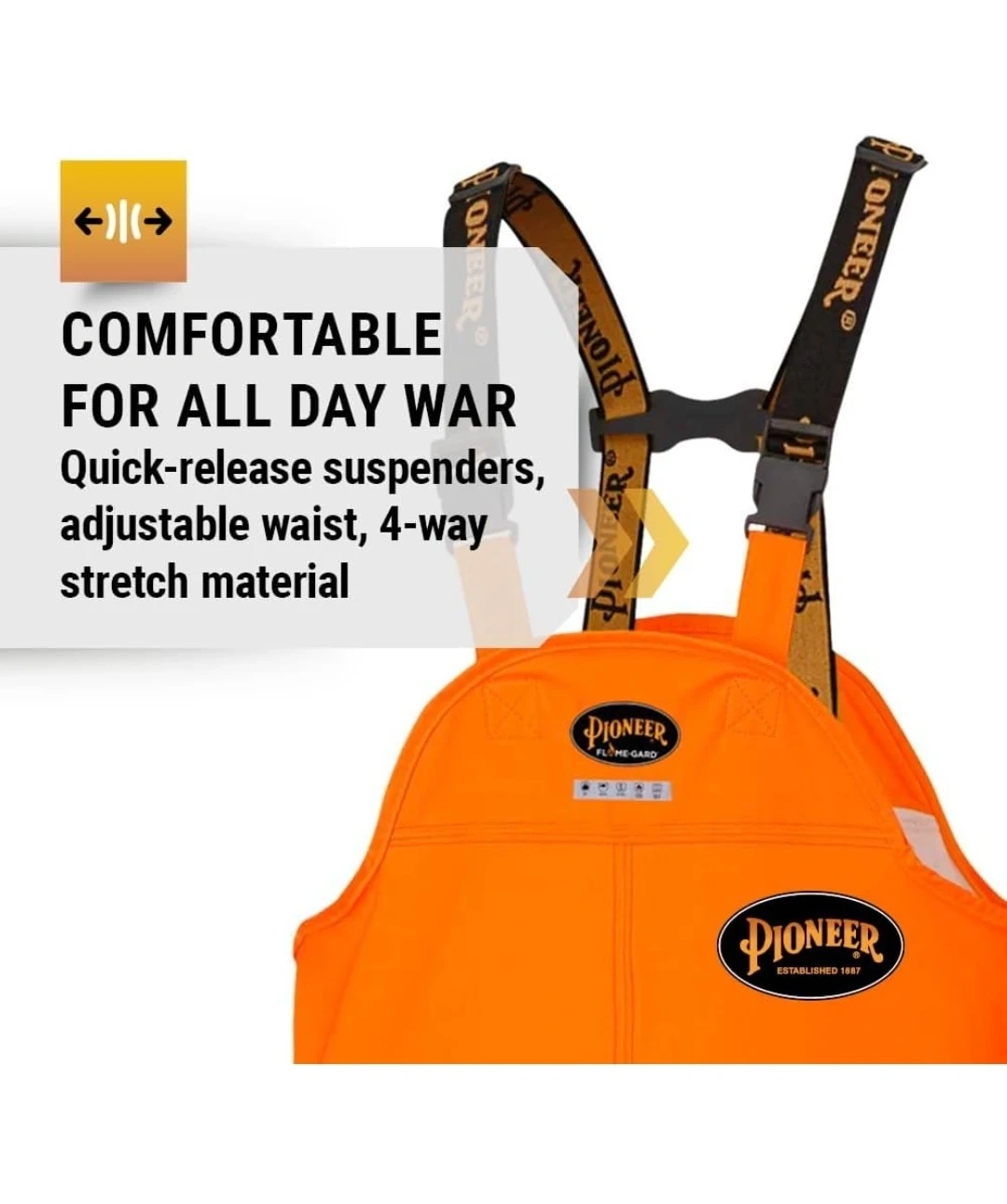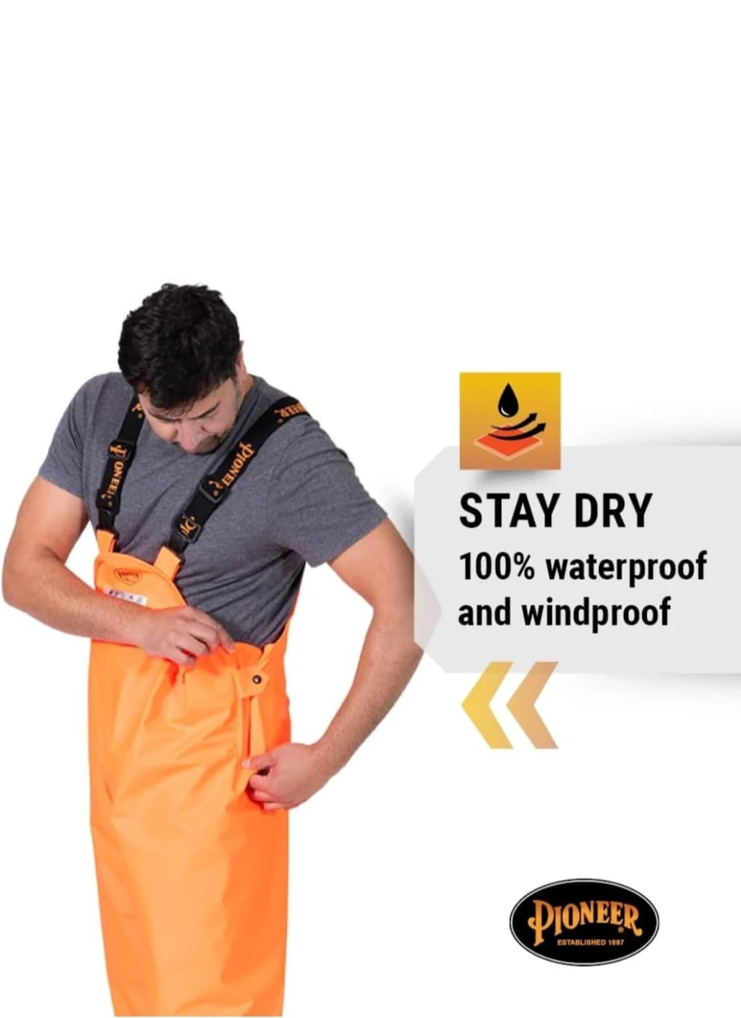 Selling a pair of Pioneer rain bib pants in bright orange! They're a size 2XL/2TG and have reflective stripes near the ankles for visibility. Great for outdoor work or activities where you need to stay dry