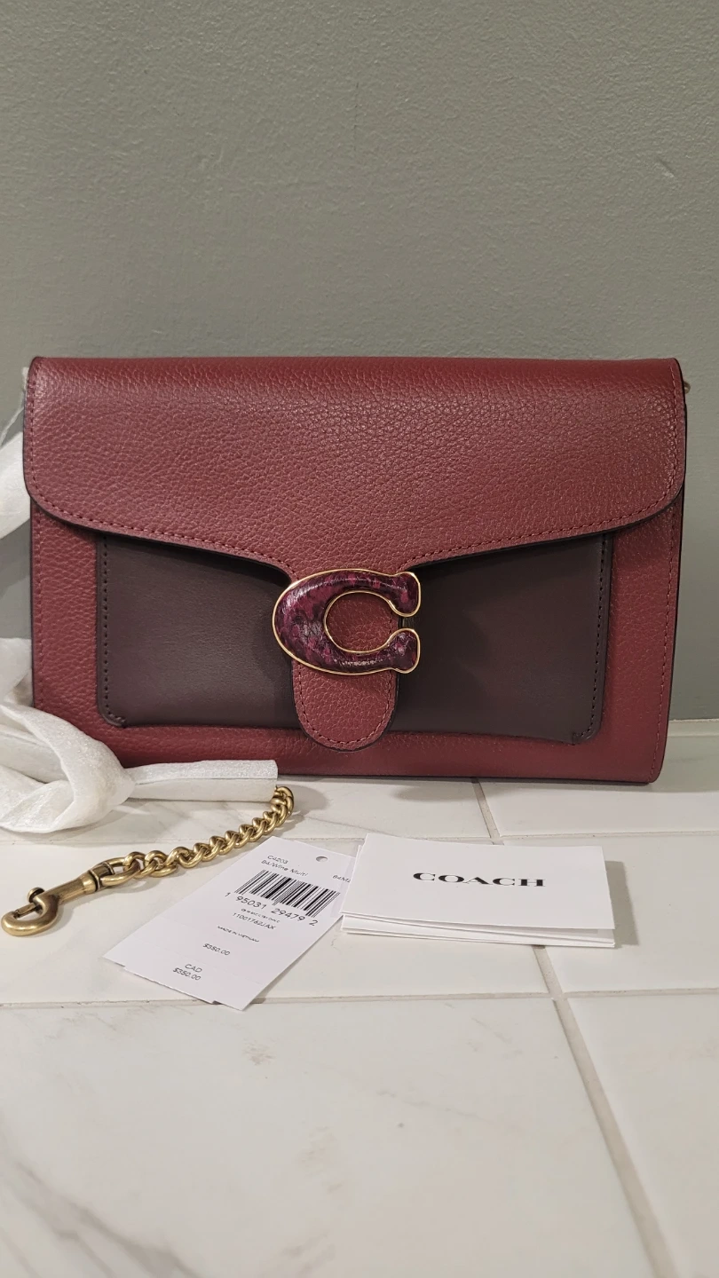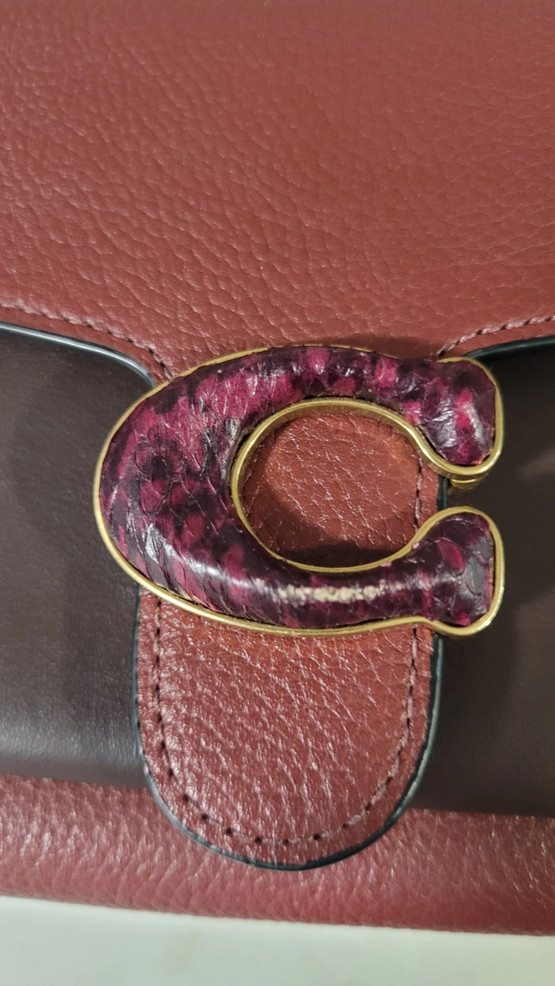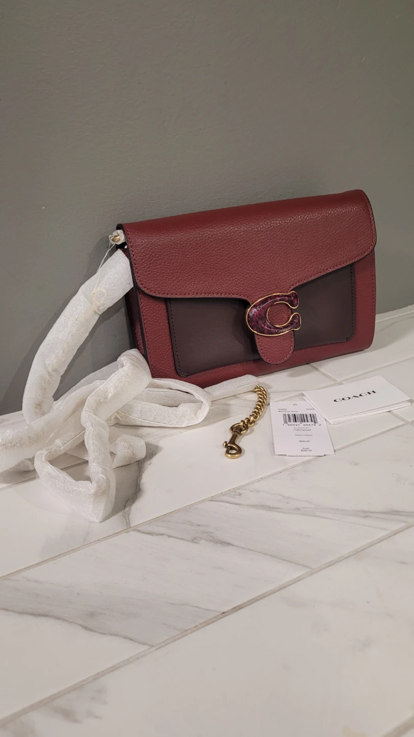 Authentic Coach Tabby purse with detachable chain. New with tags. Over 5 compartments inside, full side for cards, full inside zip closures. Beautiful Port wine color with snake print logo.