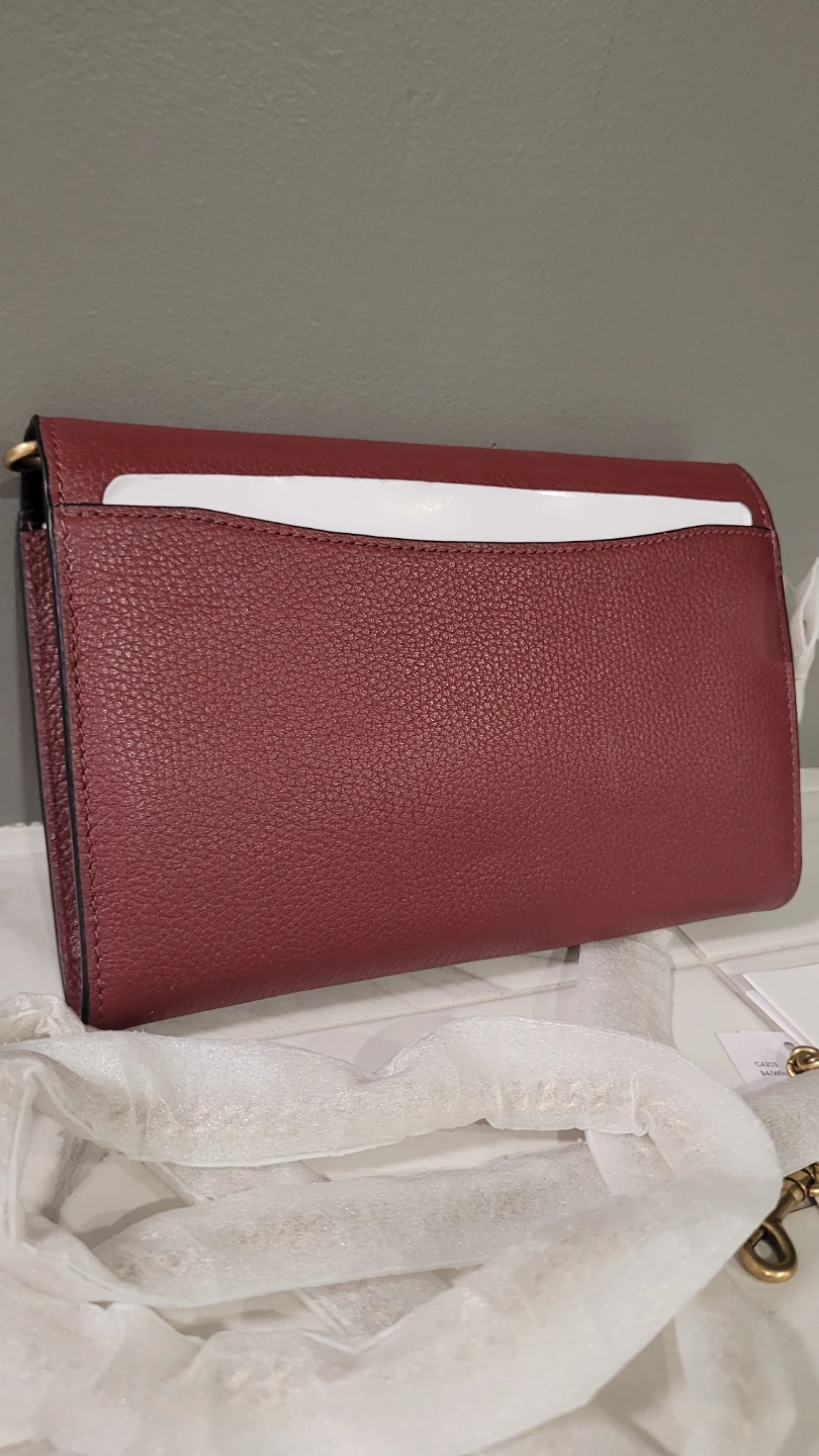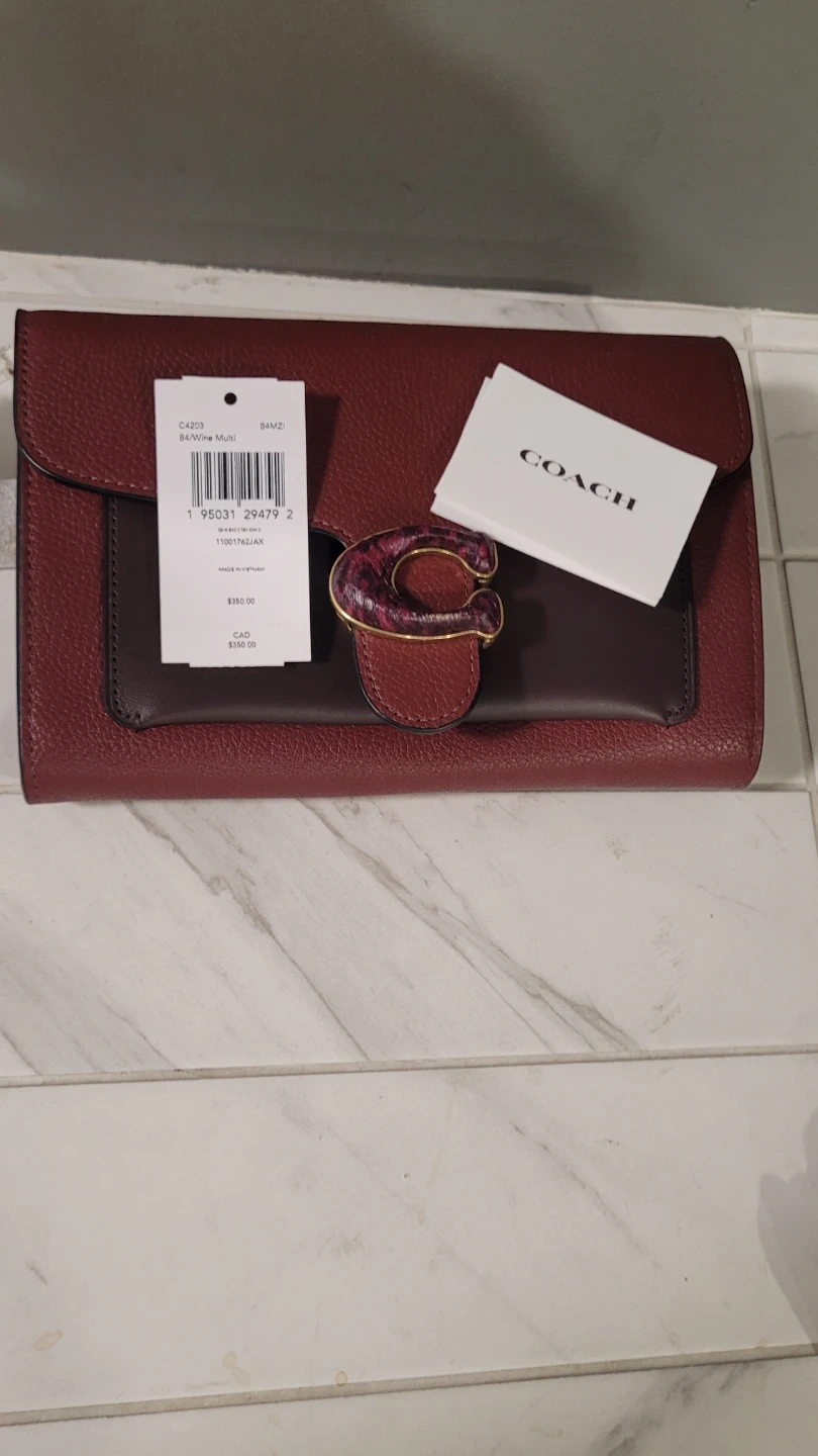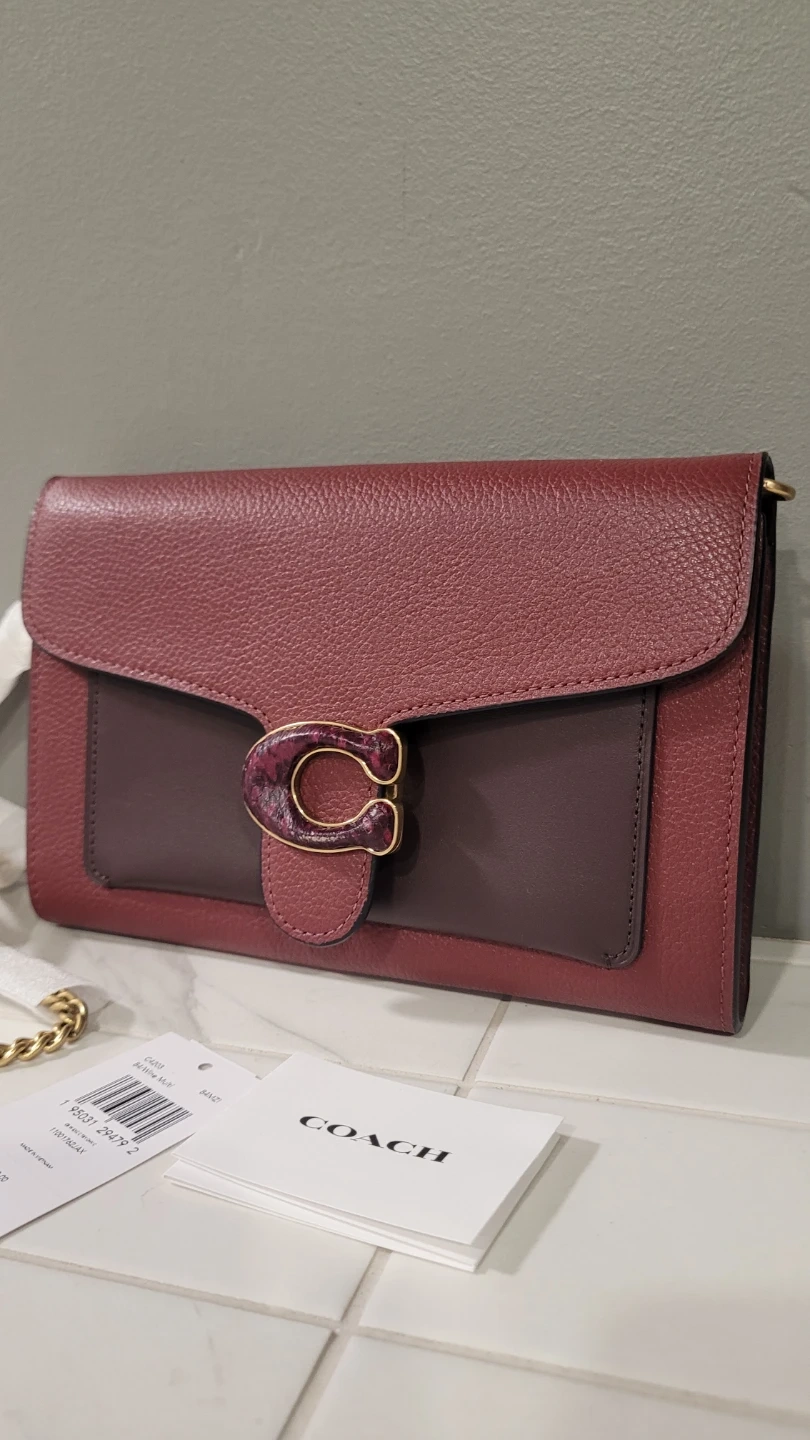 Authentic Coach Tabby purse with detachable chain. New with tags. Over 5 compartments inside, full side for cards, full inside zip closures. Beautiful Port wine color with snake print logo.