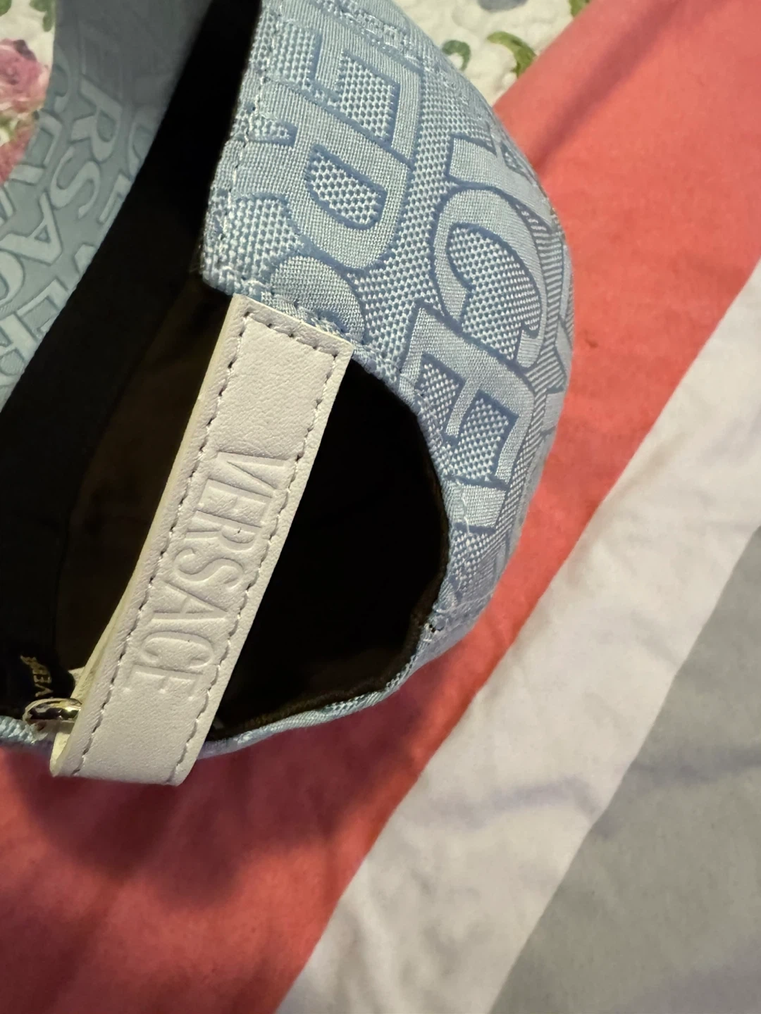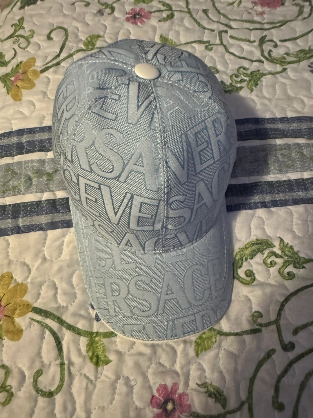 Selling a light blue Versace baseball cap. It features the Versace logo pattern throughout. Great for adding a touch of luxury to your everyday look!