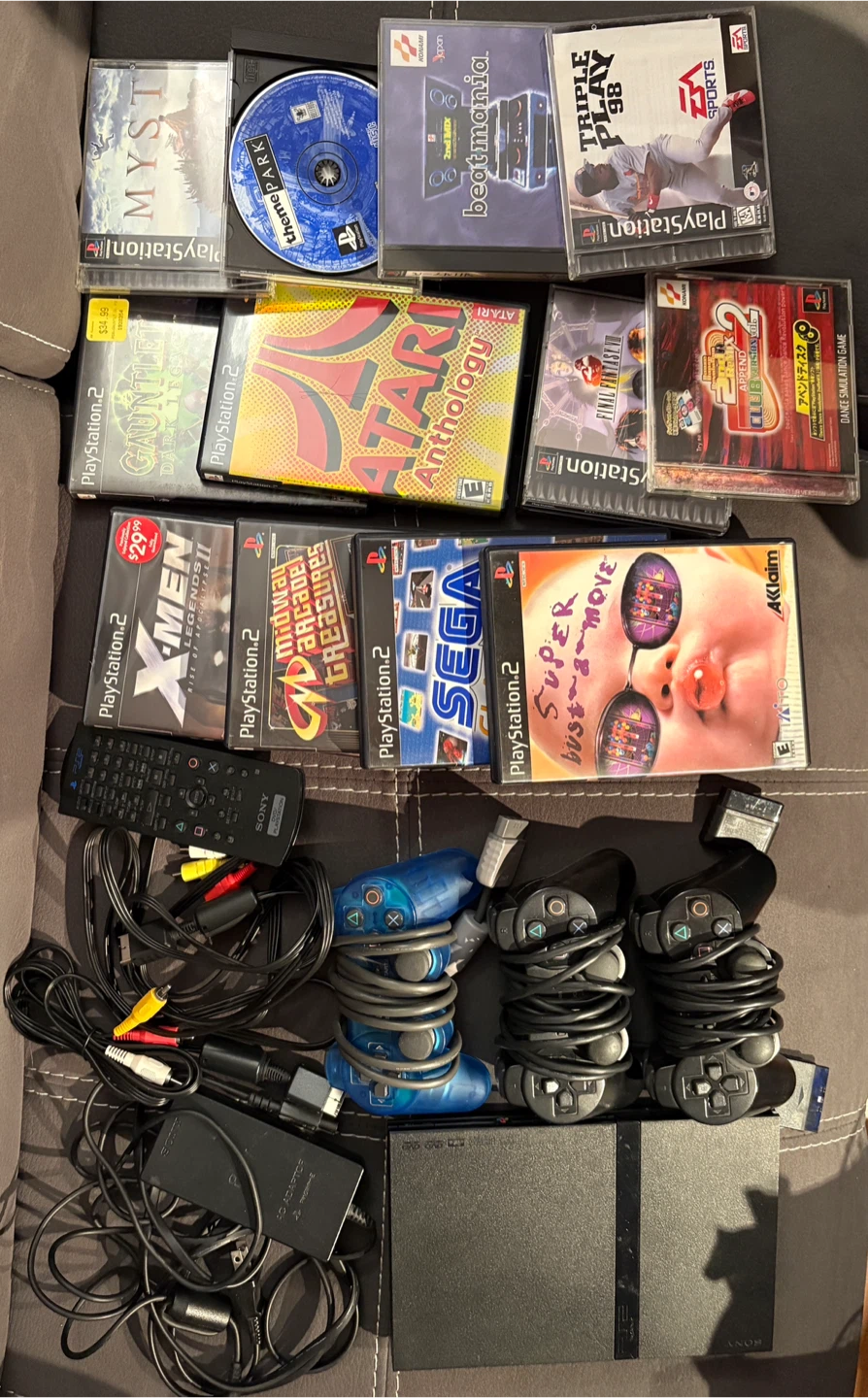 Selling a PlayStation 2 - Includes console, 3 controllers, and a selection of PS2 and PS1 games. Also comes with necessary cables and a Sony remote. Great for reliving some classic gaming moments!
